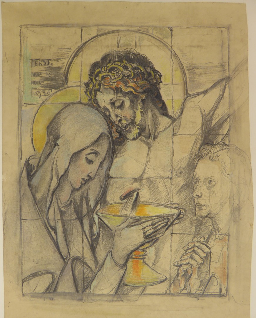Ontwerp glasraam met Maria en de gekruisigde Christus