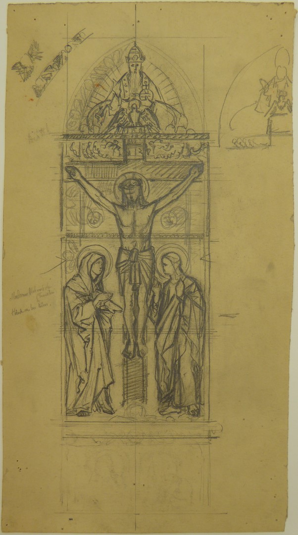 Ontwerp glasraam met Calvarie waarbij God de Vader en de H. Geest