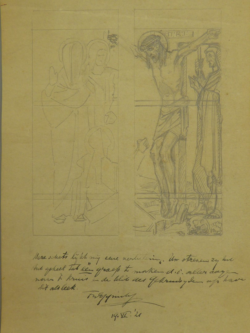 Schetsontwerp glasraam met Calvarie (Groningen, St. Josephkerk), met handschrift van pastoor Franciscus Eppink