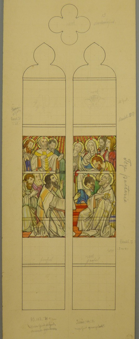 Ontwerp glasraam met voorstelling van Pinksteren (Groningen, St. Josephkerk)
