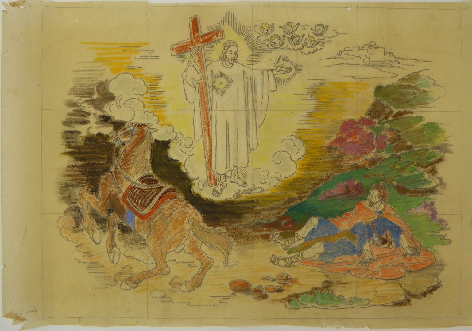 Ontwerp glasraam met Paulus op weg naar Damascus