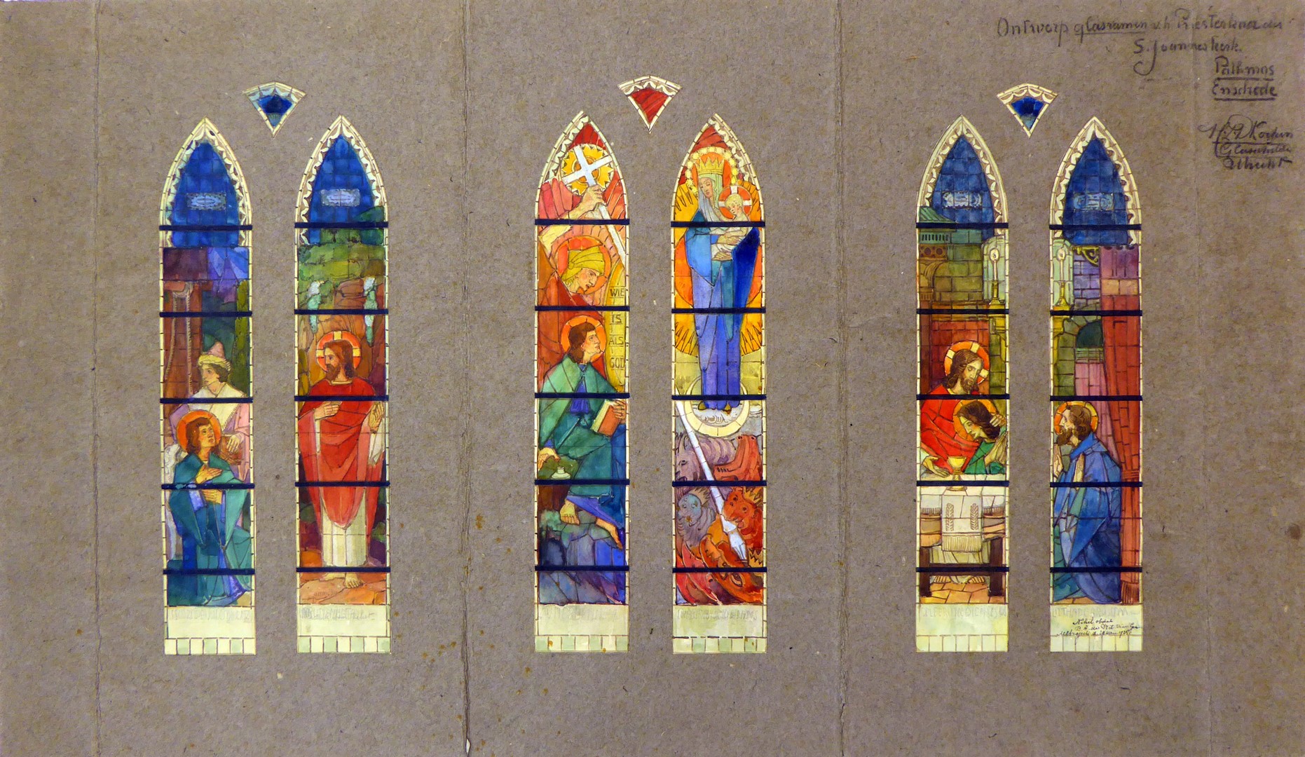 Ontwerp negen glasramen met o.a. de roeping van Johannes (Enschede, St. Johannes op Pathmoskerk)