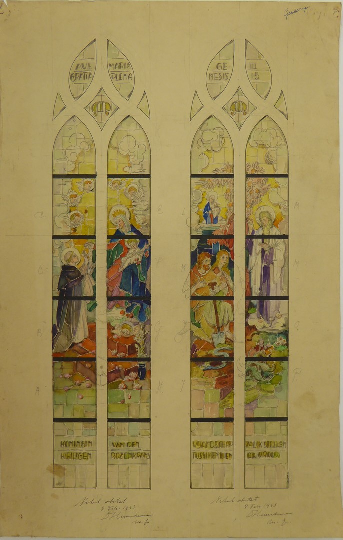 Ontwerp twee glasramen met Maria (rozenkrans), en God met Adam en Eva (Gendringen, St. Martinuskerk