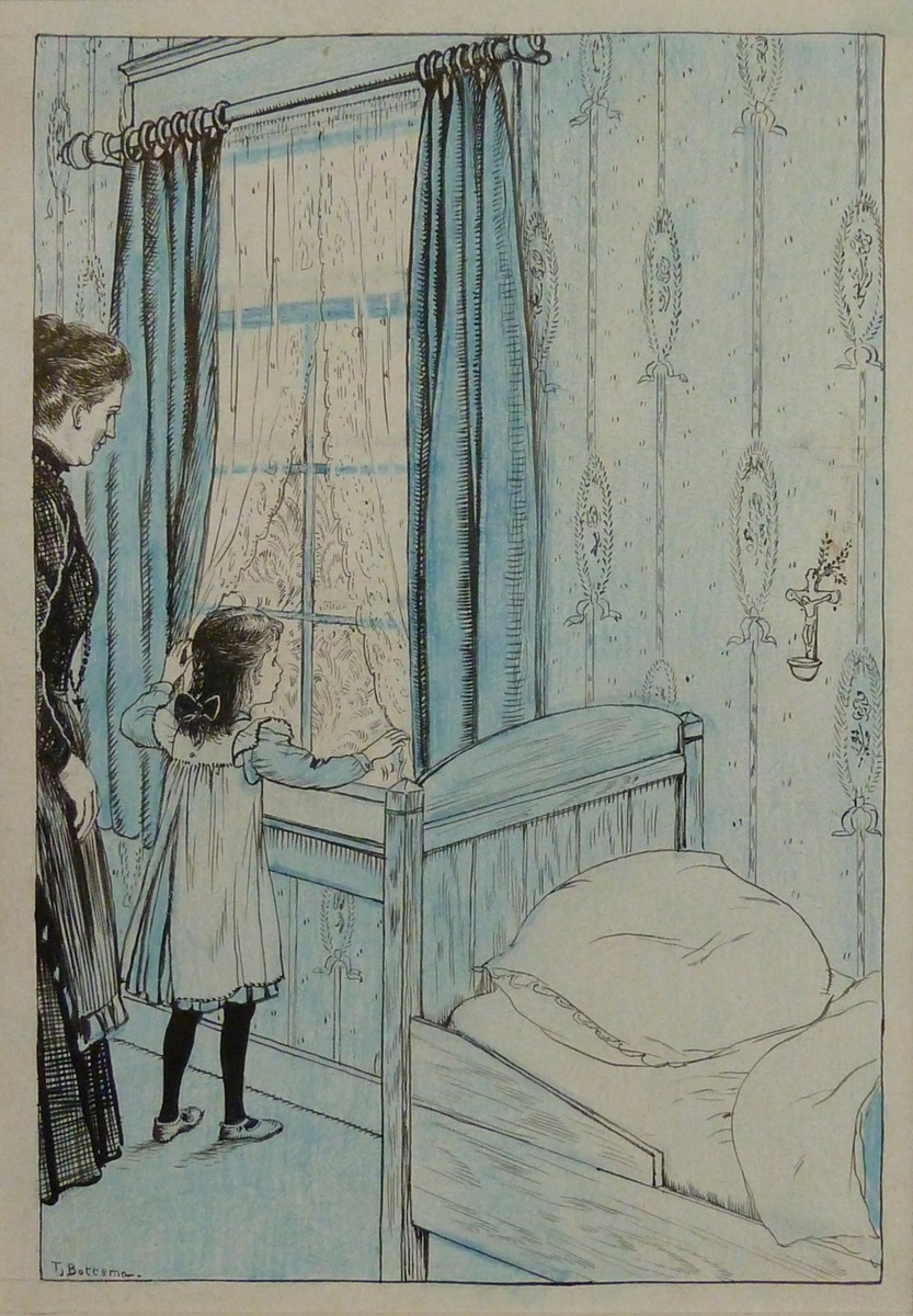 Ontwerp illustratie lesboek voor R.K. meisjes met moeder en dochter in slaapkamer