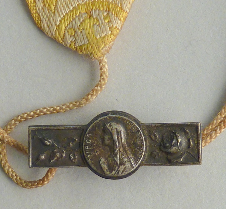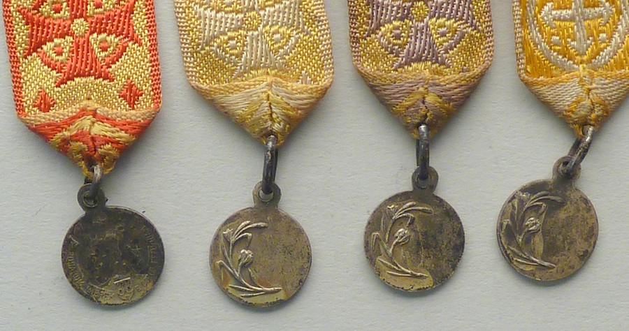 Metalen beugeltje waaraan vier missaallinten met ingeweven kruisjes, elk met kleine devotiemedaille onderaan