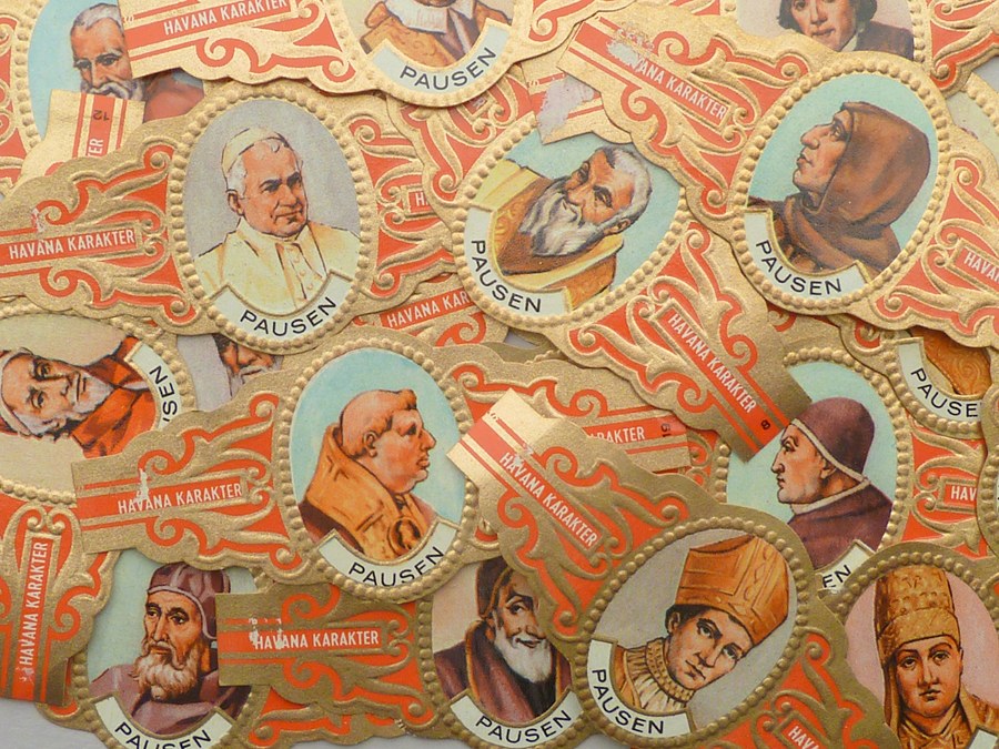 Kavel van 22 sigarenbandjes, merk Havana Karakter, met beeltenissen van pausen, onder wie paus Johannes XXIII