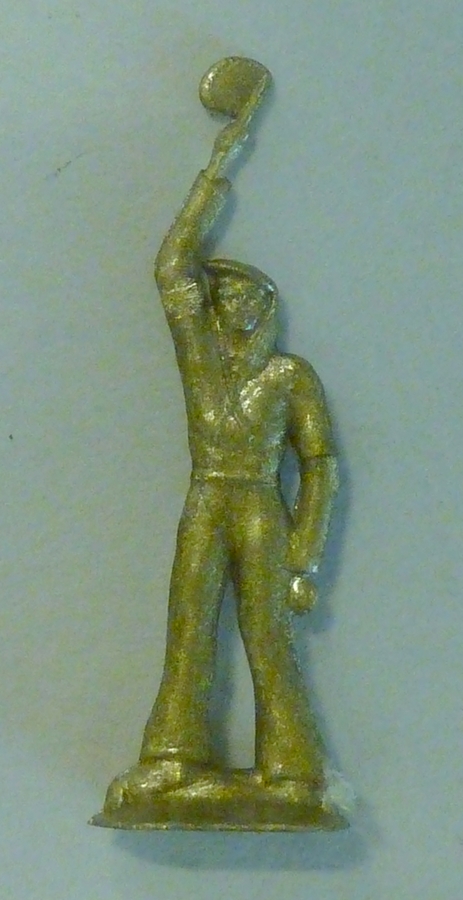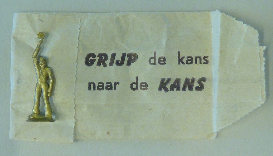 Papieren wikkel waarin plastic vaandrager, met aansporingen om geld te doneren aan het Katholiek Thuisfront, achterop met "Uw gift is vrij maar, gaf u wel genoeg?? ..."