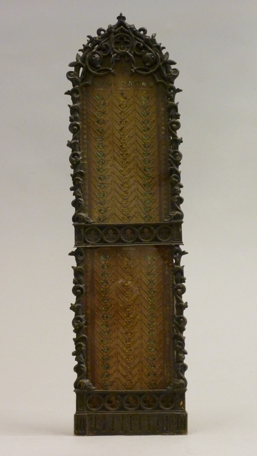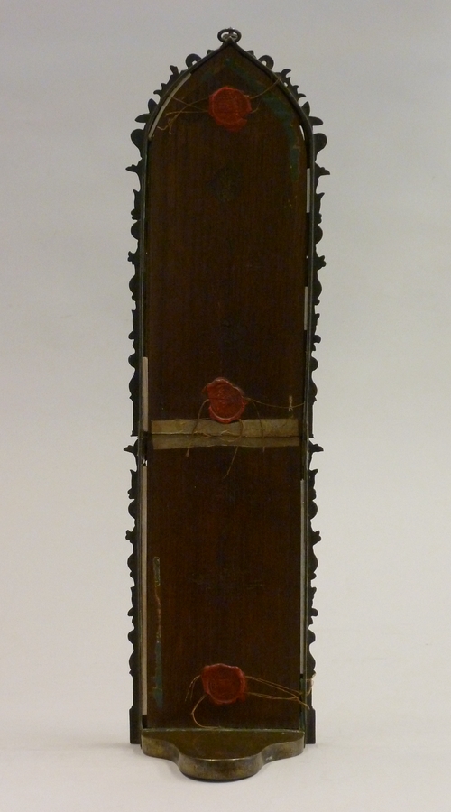 Jaarkalender, januari t/m juni, met relieken van de dagheiligen, in metalen lijst met opengewerkte vierpassen