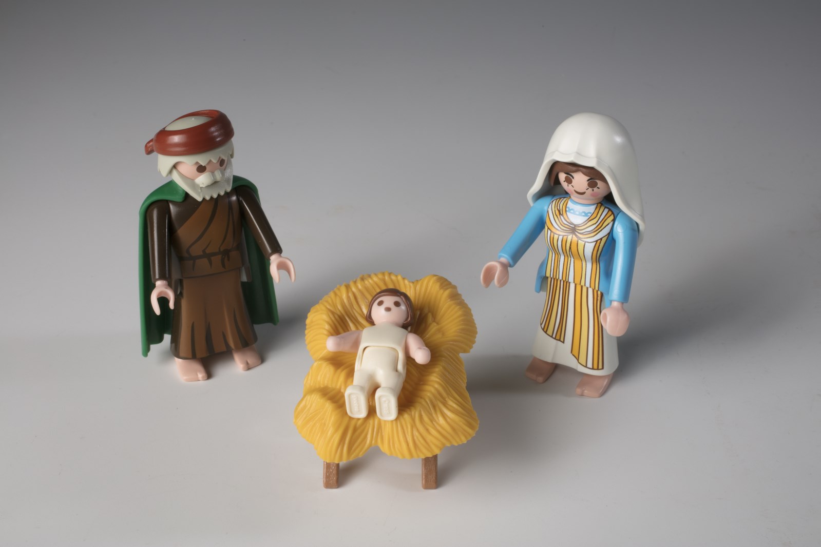 Playmobil kerstgroep: stal met heilige familie, engel, os, ezel, herder met schapen en geit, kampvuur met ketel, bankjes, mand met houtblokken en poezen