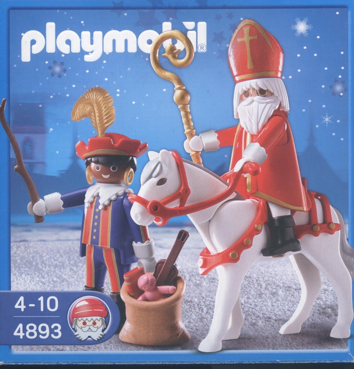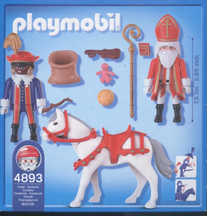 Playmobil groep bestaande uit Sinterklaas en Zwarte Piet met toebehoren: paard, staf, boek, roe, zak met pop, bal en gitaar
