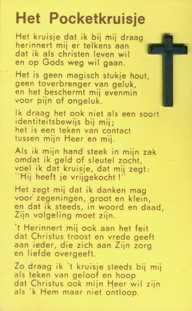 Miniatuurkruisje op geel karton met tekst: Het Pocketkruisje Het kruisje dat ik bij mij draag herinnert mij er telkens aan dat ik als christen leven wil en op Gods weg wil gaan. Het is geen magisch stukje hout, geen toverbeschermer van geluk, en beschermt mij evenmin voor pijn of ongeluk. Ik draag het ook niet ...