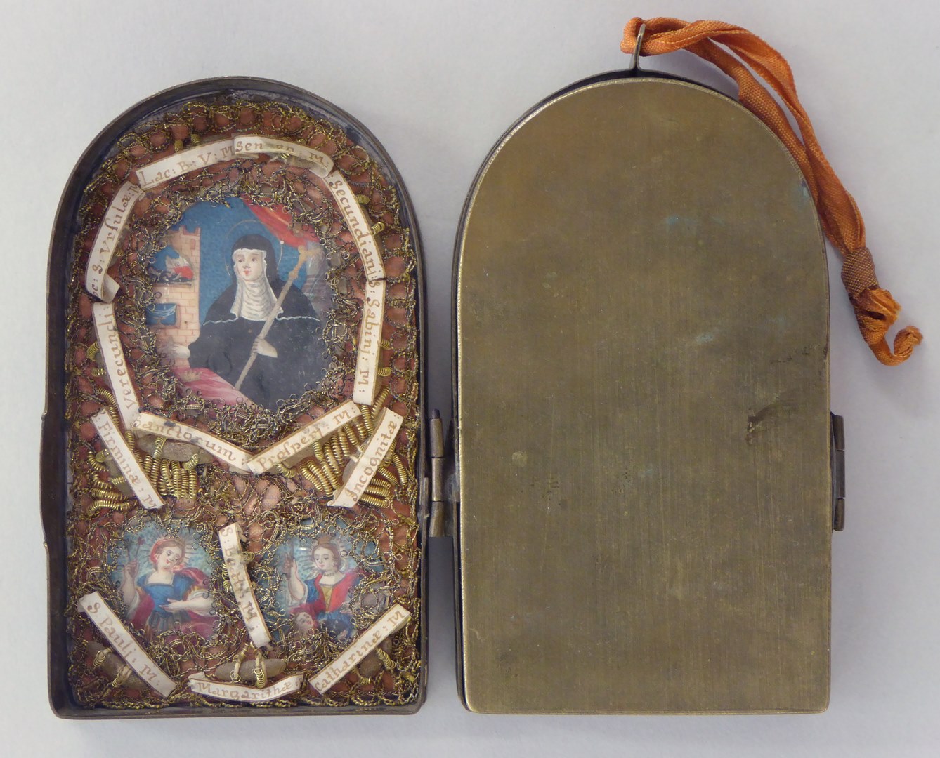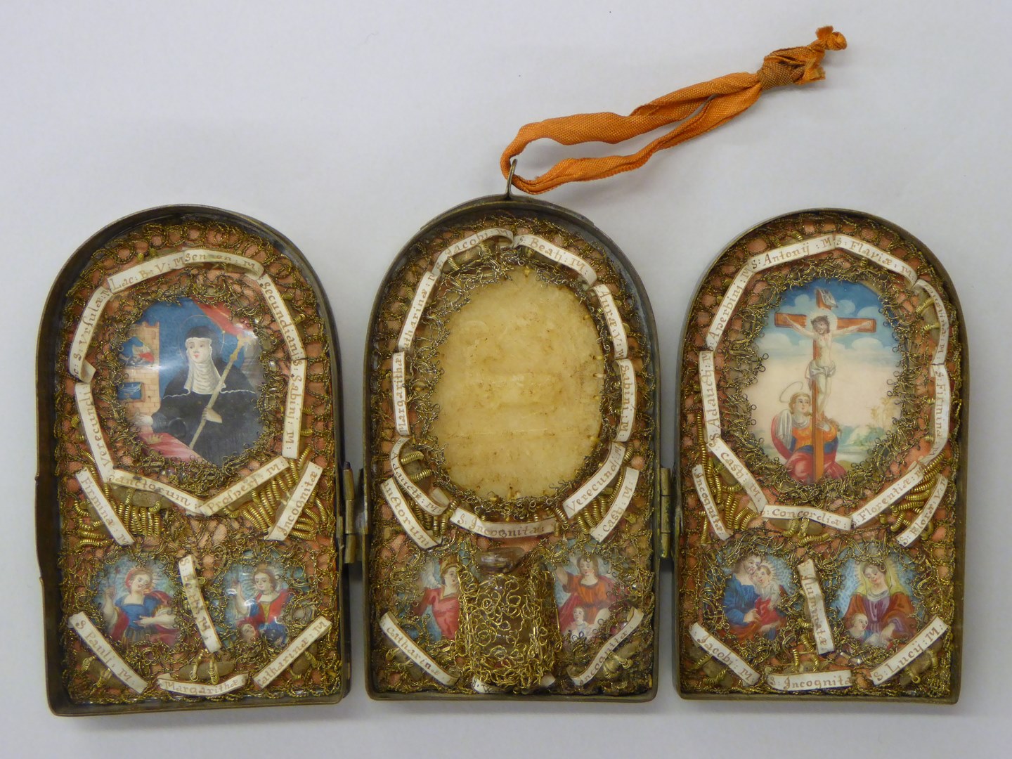 Reliekdoosje in vorm van drieluik met in middelste luik een Agnus Dei van Benedictus XIII (1724-1730) waaronder een flesje en twee voorstellingen van heiligen, op het linkerluik H. Elisabeth van Portugal, plus twee heiligen, op het rechterluik een voorstelling van Christus aan het kruis, plus twee heiligen.