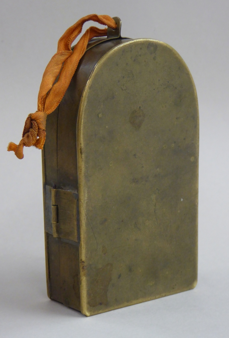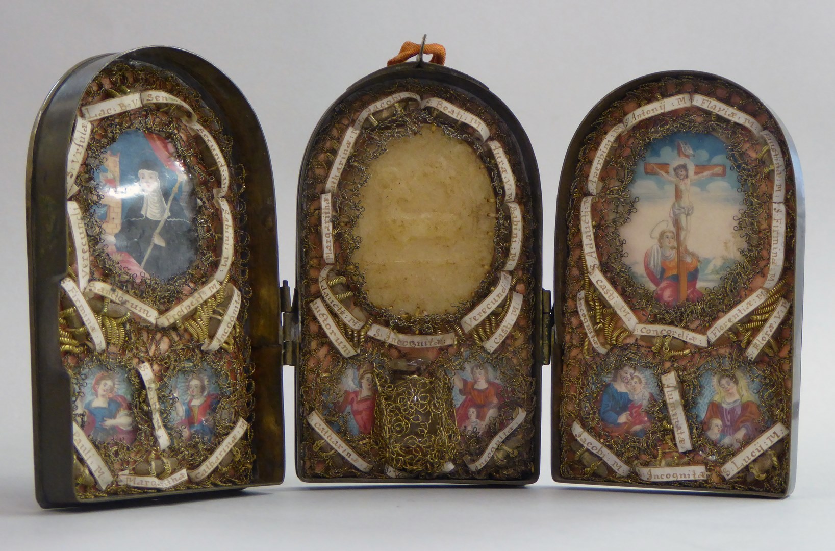 Reliekdoosje in vorm van drieluik met Agnus Dei, flesje, prentjes en relieken