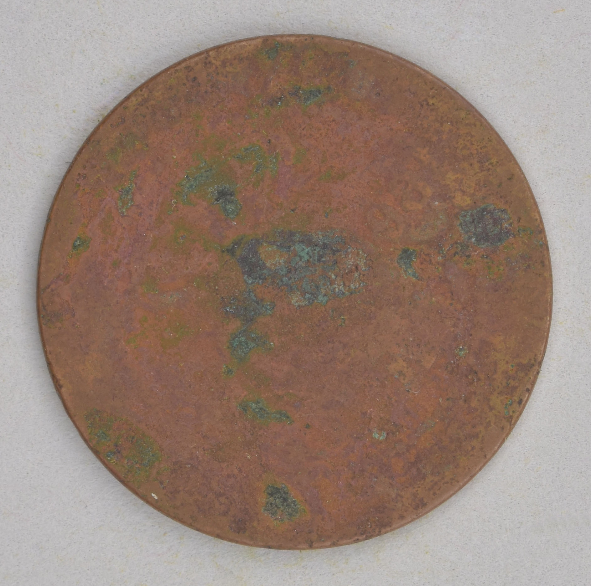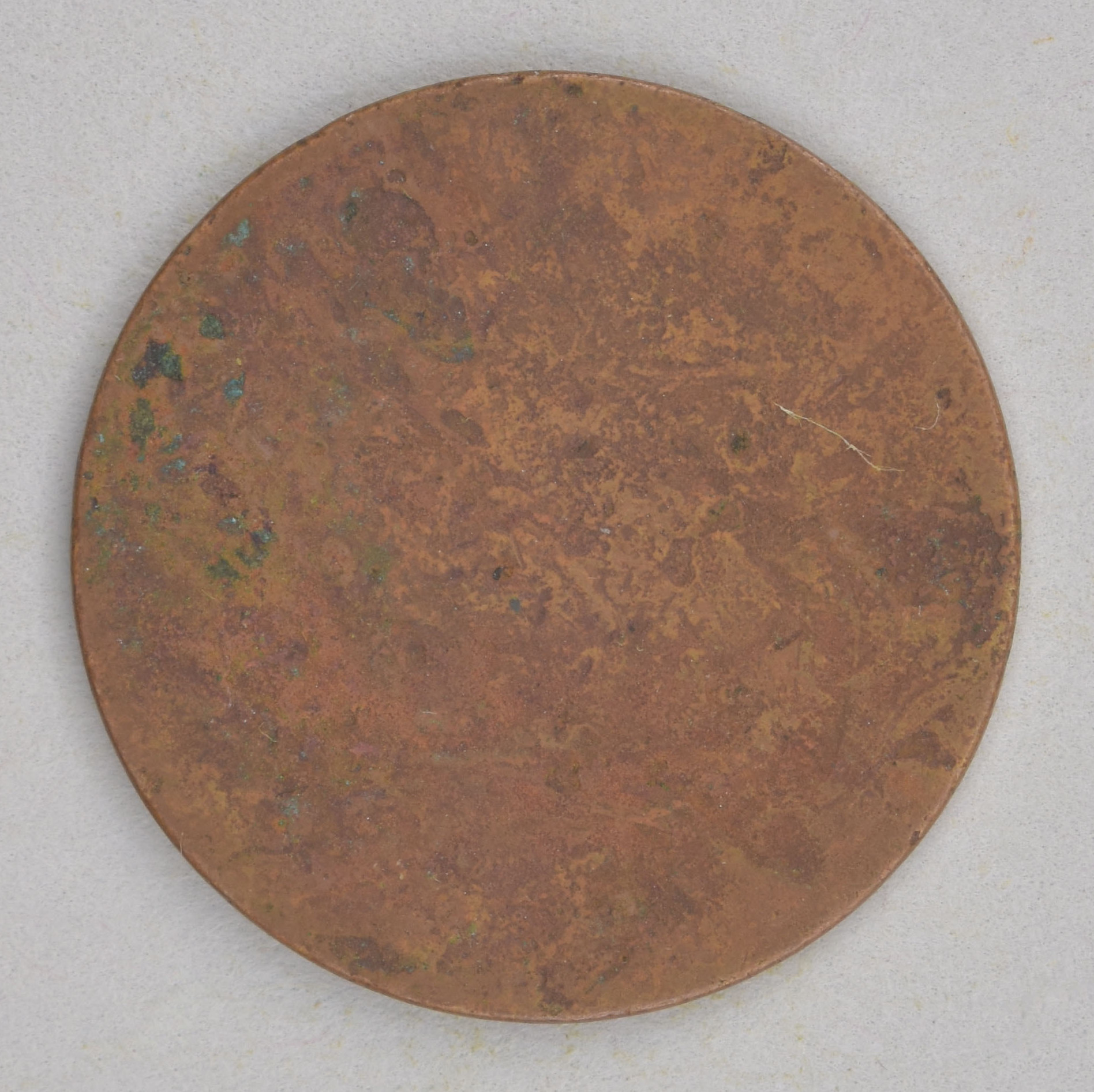 Natzar, munten als offergave behorend bij piring: 1 cent(?) Nederlands-Indië, voor- en keerzijde geheel weggesleten, in wit papier gevouwen