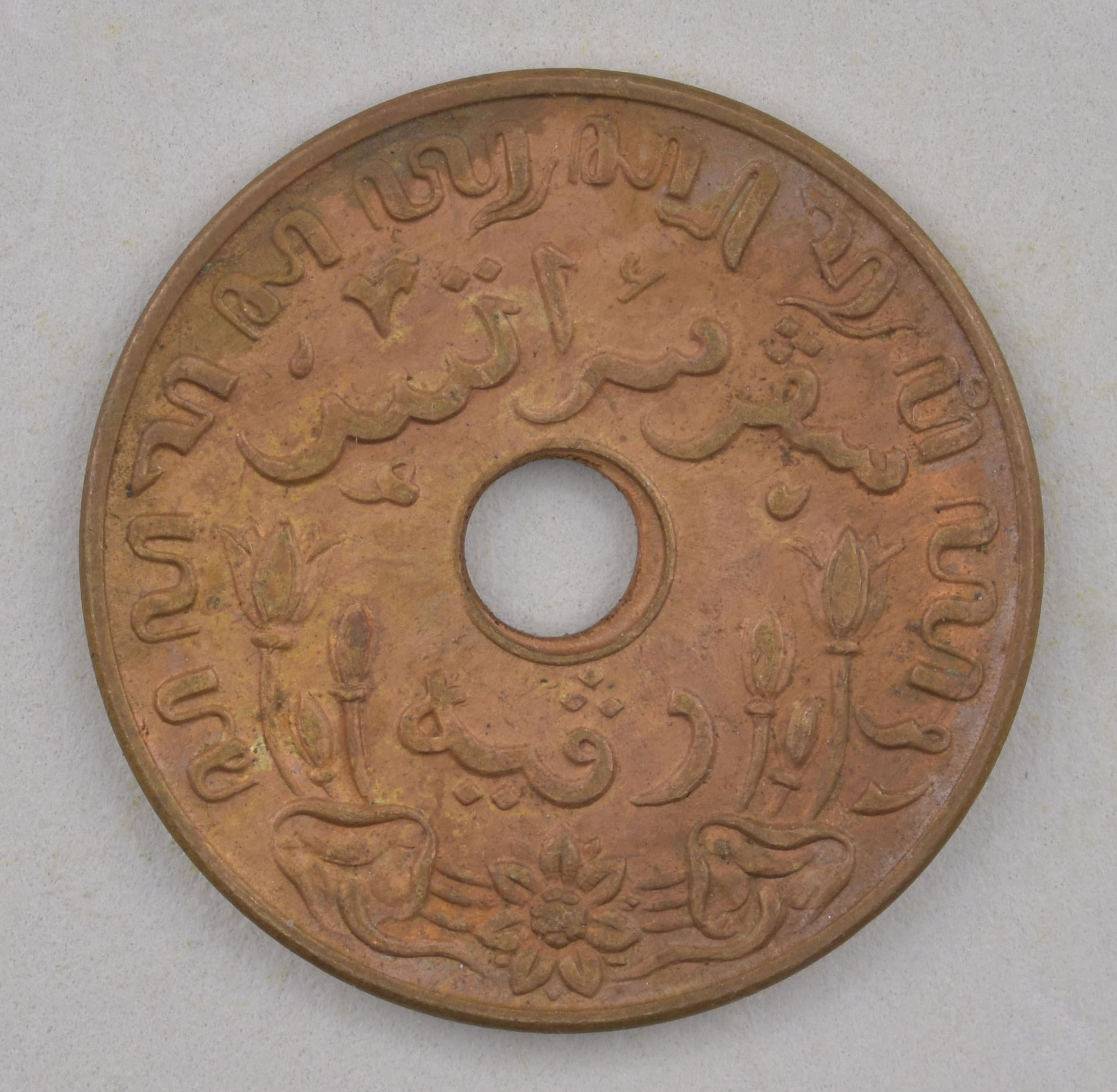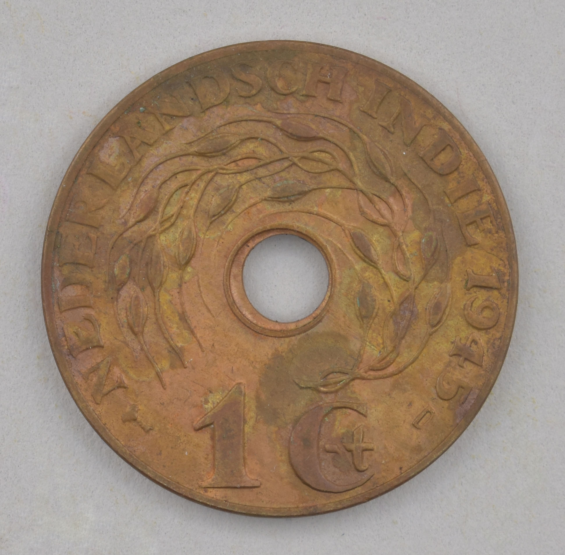 Natzar, munten als offergave behorend bij piring: 1 cent Nederlands-Indië, met gat, kz. waarde-aanduiding in het Maleis en Javaans