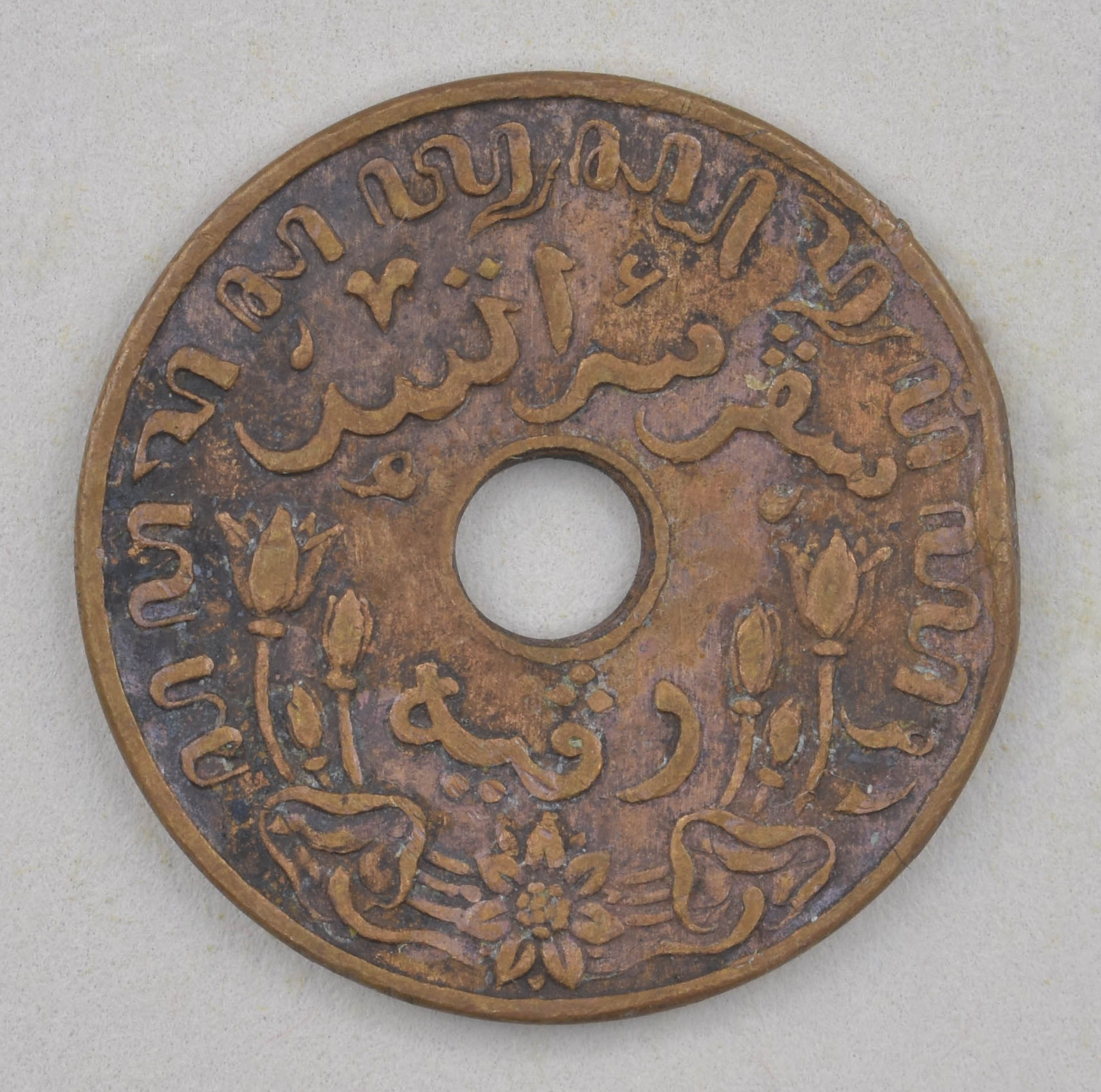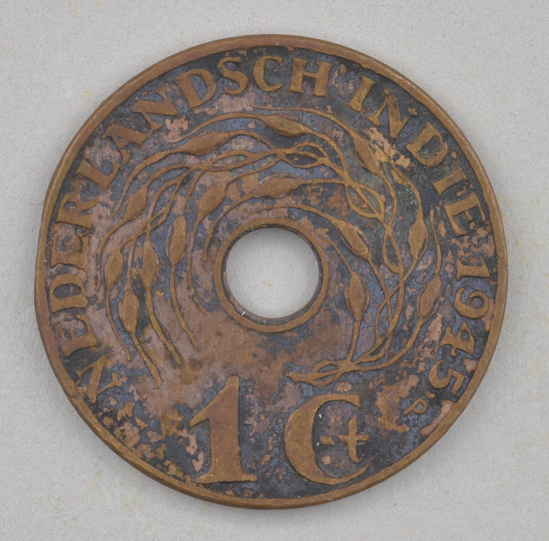 Natzar, munten als offergave behorend bij piring: 1 cent Nederlands-Indië, met gat, kz. waarde-aanduiding in het Maleis en Javaans