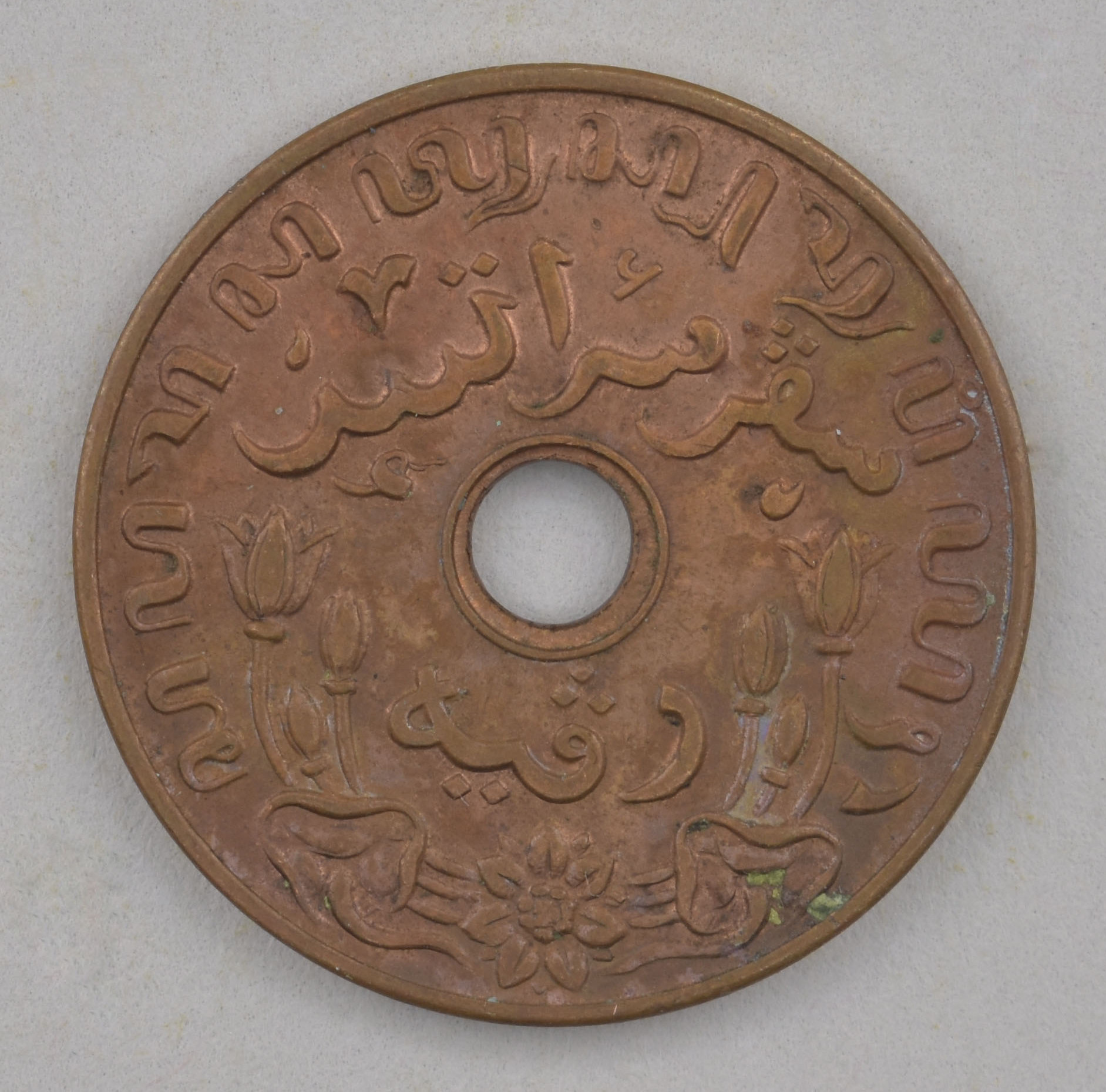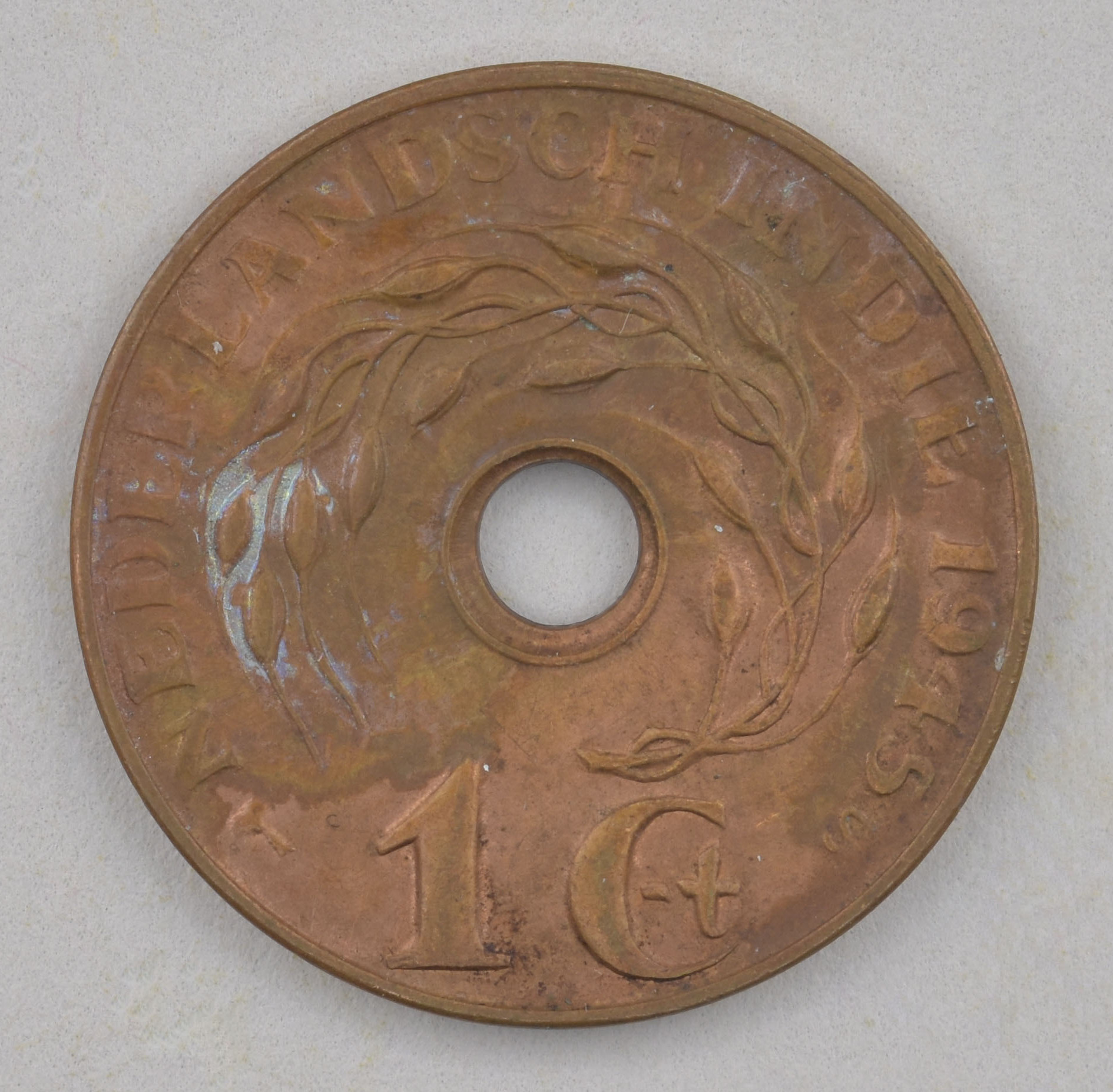 Natzar, munten als offergave behorend bij piring: 1 cent Nederlands-Indië, met gat, kz. waarde-aanduiding in het Maleis en Javaans