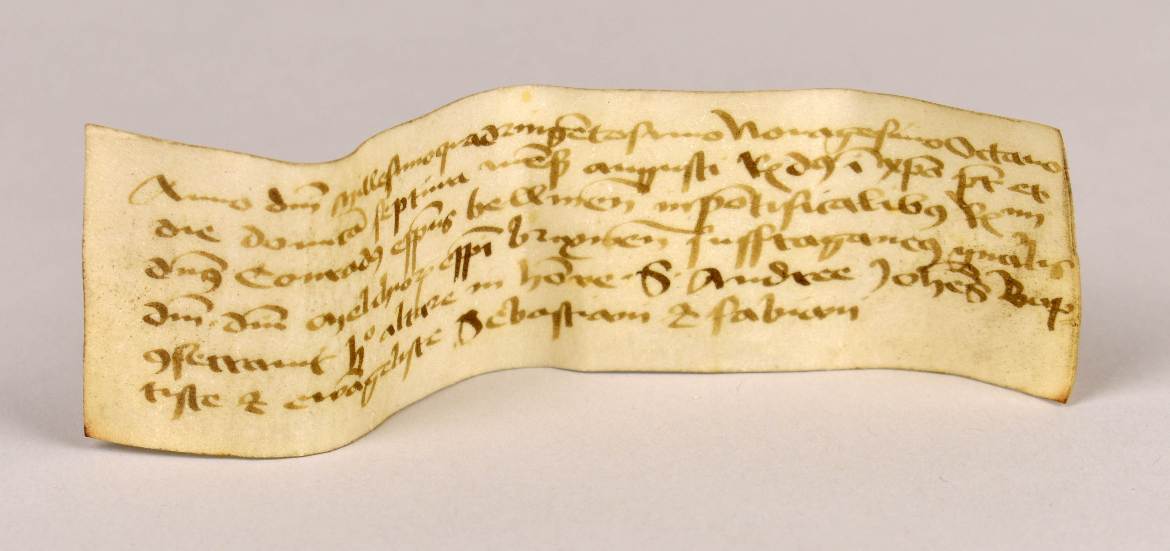 De transcriptie van de cedula is als volgt: Anno domini millesimo quadrigentesimo nonagesimo octavo die dominica septima mensis augusti. Reverendus in Christo pater et dominicus Conradus episcopus Bellinensis in pontificalibus Reverendi Domini domini Melchioris episcopi Brixensis suffraganeus generalis consecravit hoc altare in honorem S. Andree, Johannis Baptiste et Evangeliste, Sebastiani et Fabiani Vrij vertaald: In ...