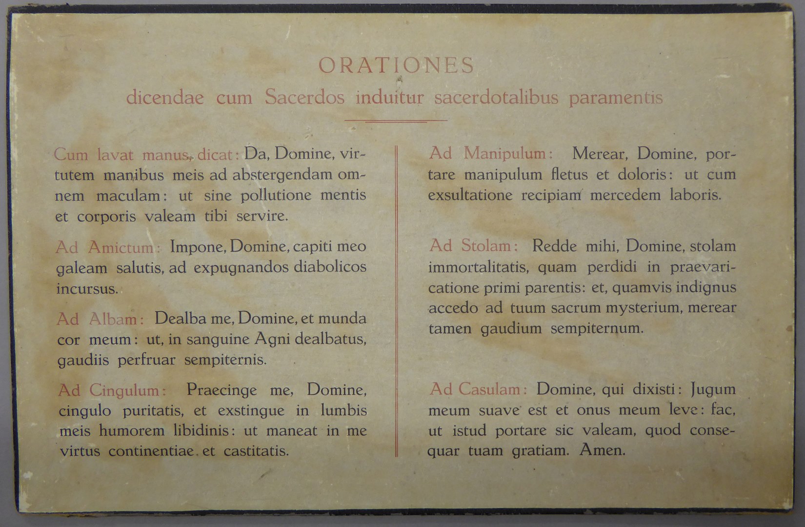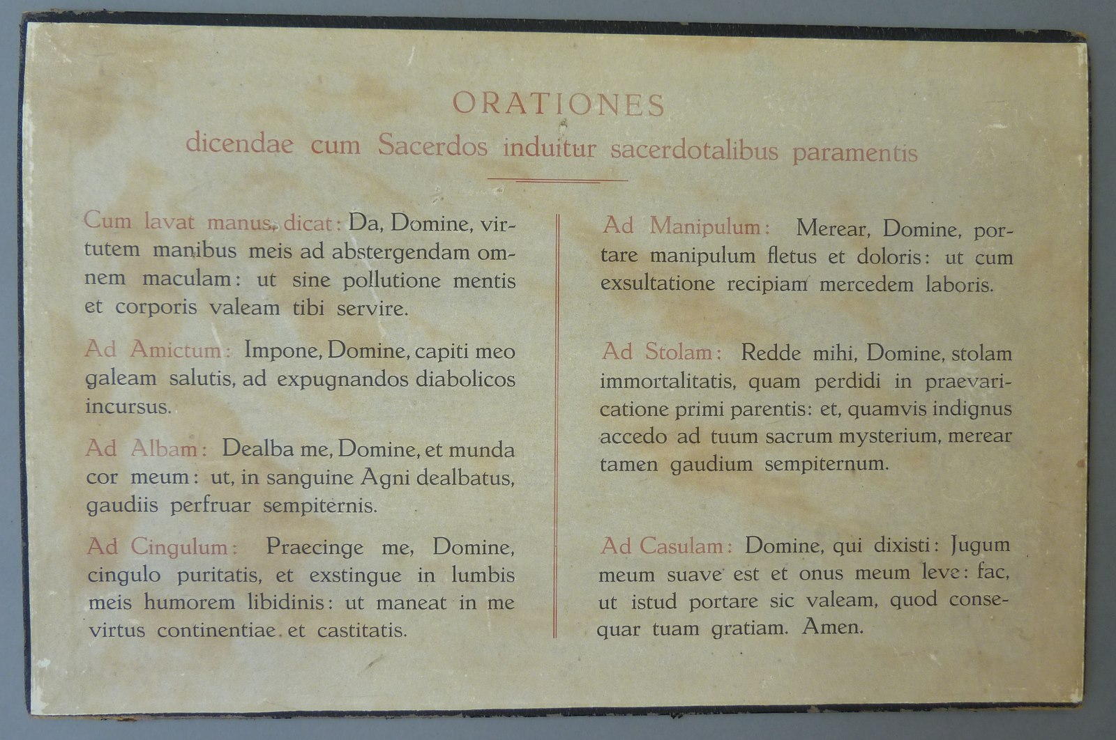 Tekstbord met Latijnse gebeden gebezigd bij aantrekken paramenten: sacristiegebeden