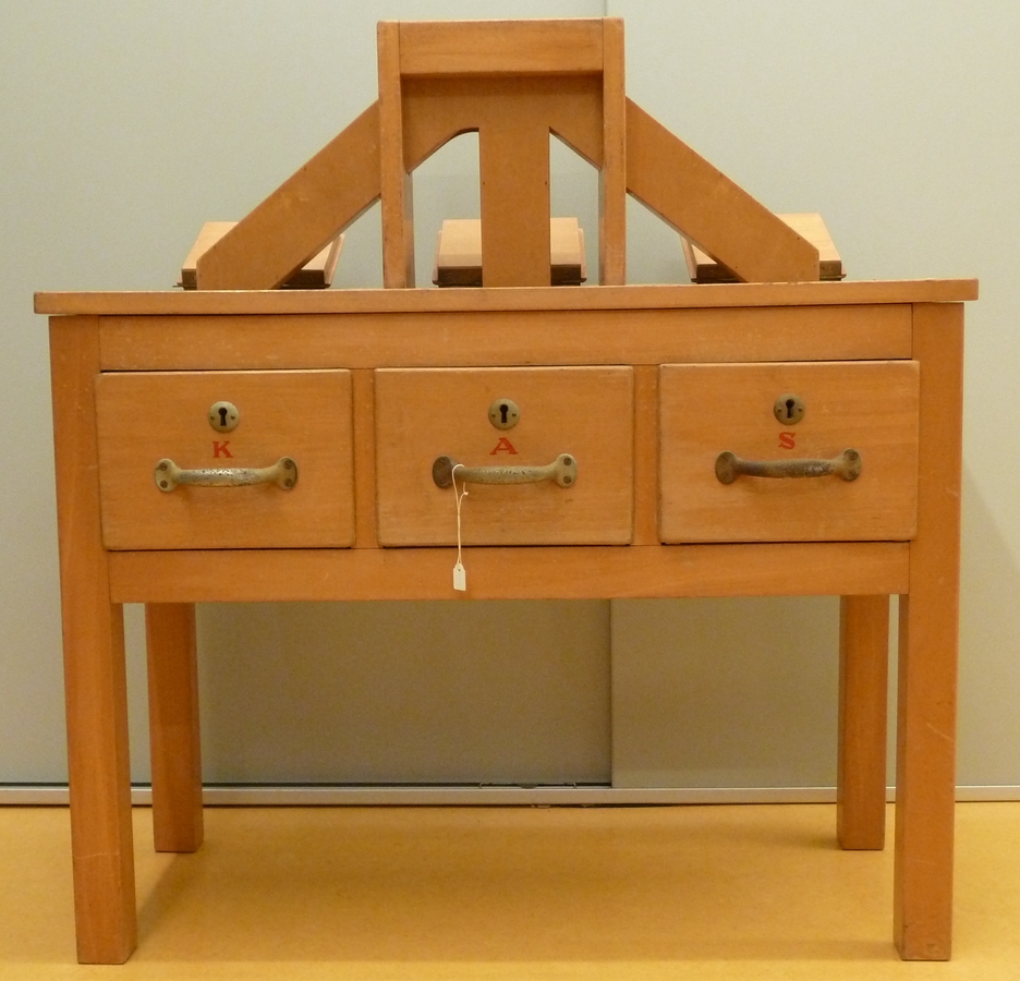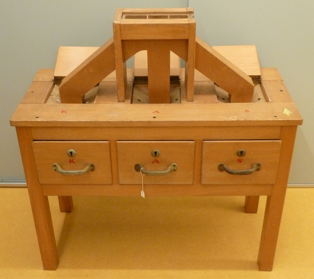 Collectesorteermeubel: kast met drie laden met "K" (kerk), "A" (armen) en "S" (studie)