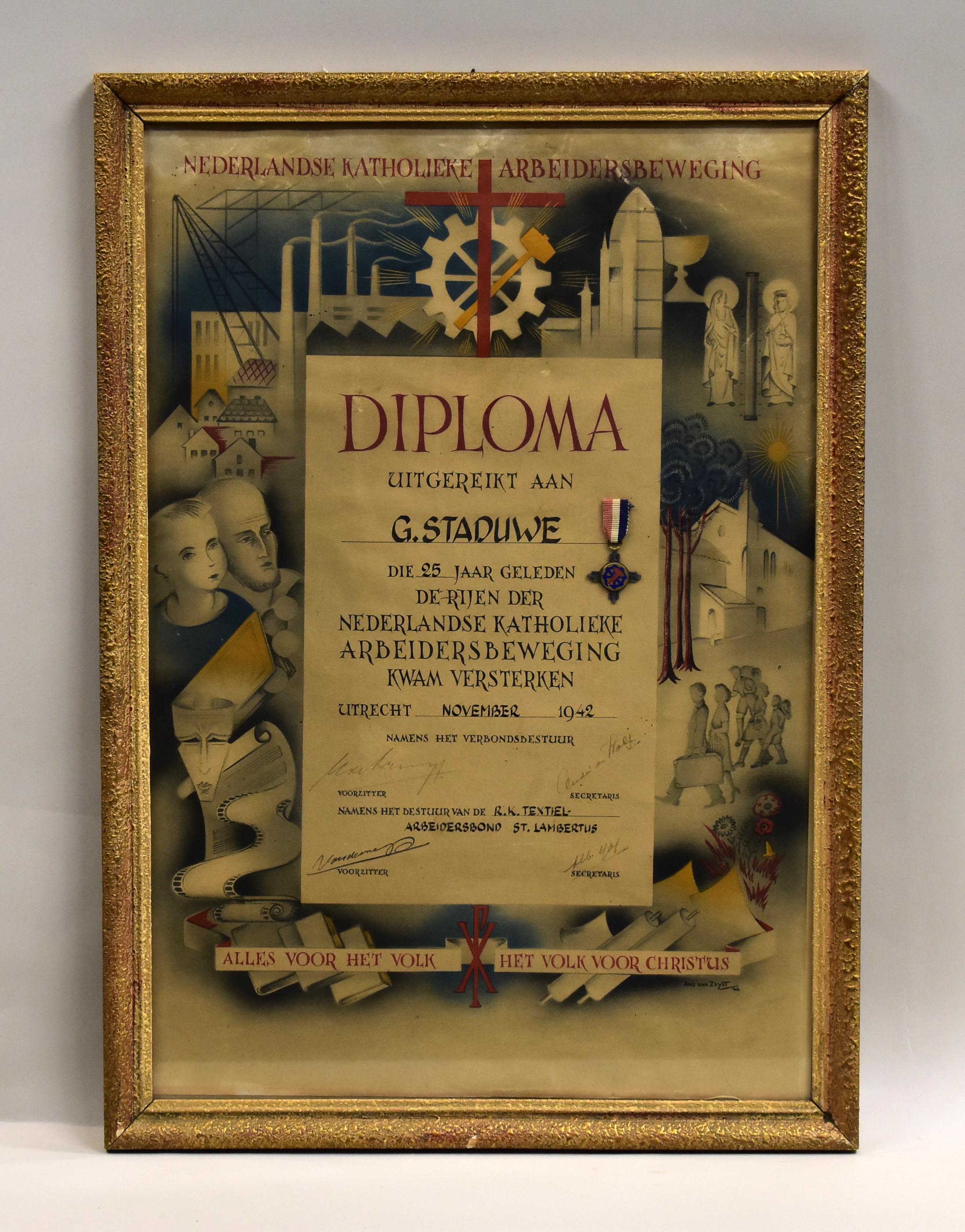 Diploma Nederlandse Katholieke Arbeidersbeweging t.g.v. 25-jarig arbeidsjublileum 1942, met medaille