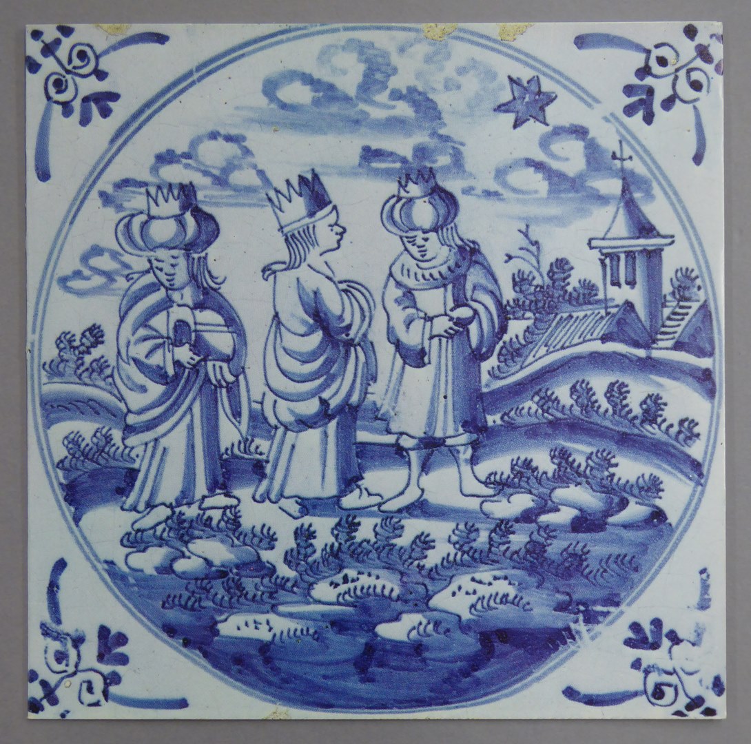 Kerstkaart met tegel waarop bijbelse voorstelling: drie koningen op weg