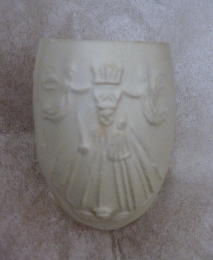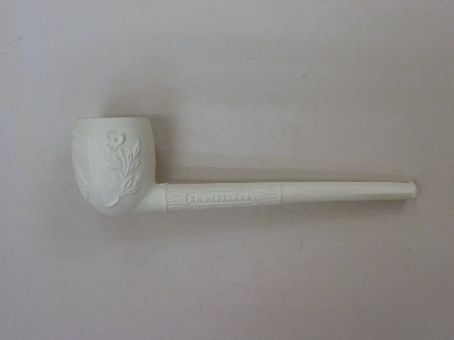 Bedevaartspijp met Maria met Kind tussen engelen met kroon, "z. andenken an Kevelaer"