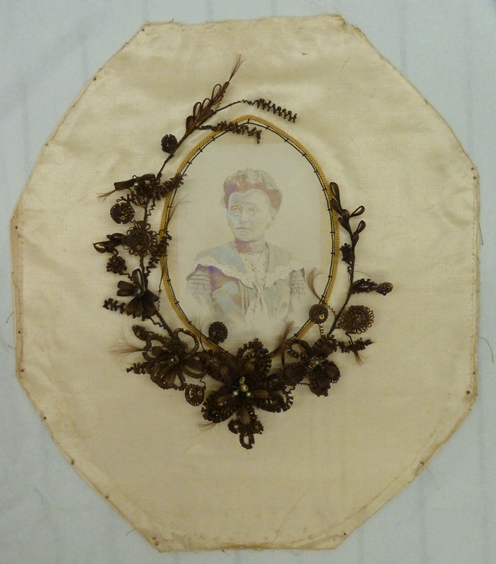 Haarschildering Maria Mathilda Clementina Michielsen-Roevens, ovaal, met foto van overledene