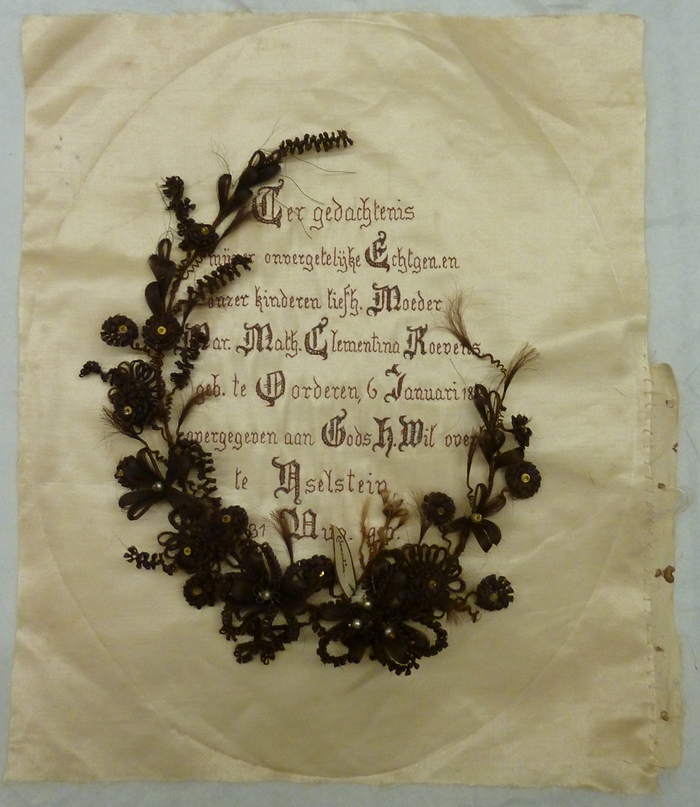 Haarschildering Maria Mathilda Clementina Michielsen-Roevens, met geborduurde tekst