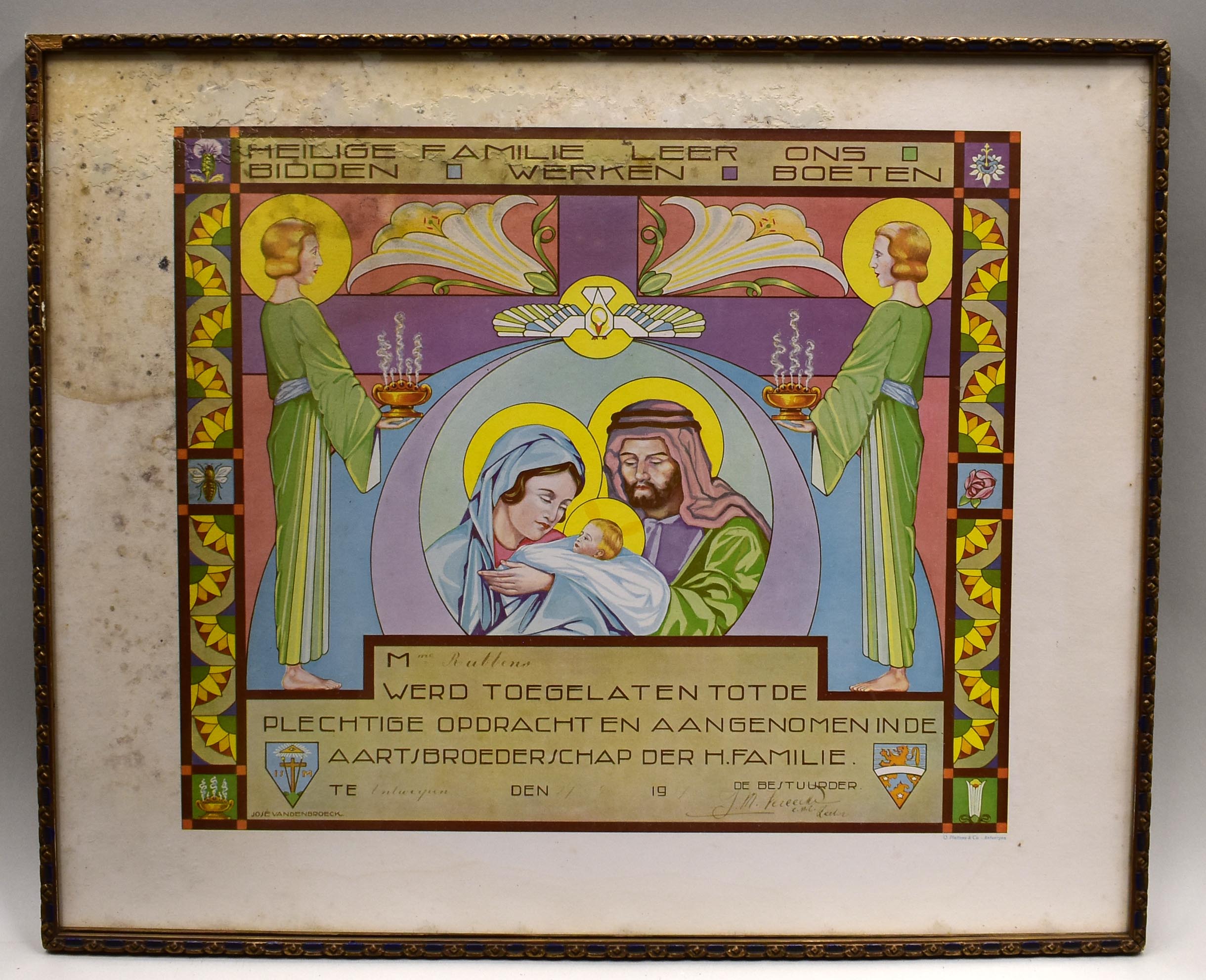 Lidmaatschapsdiploma Aartsbroederschap der H. Familie te Antwerpen van Mme Rubbens
