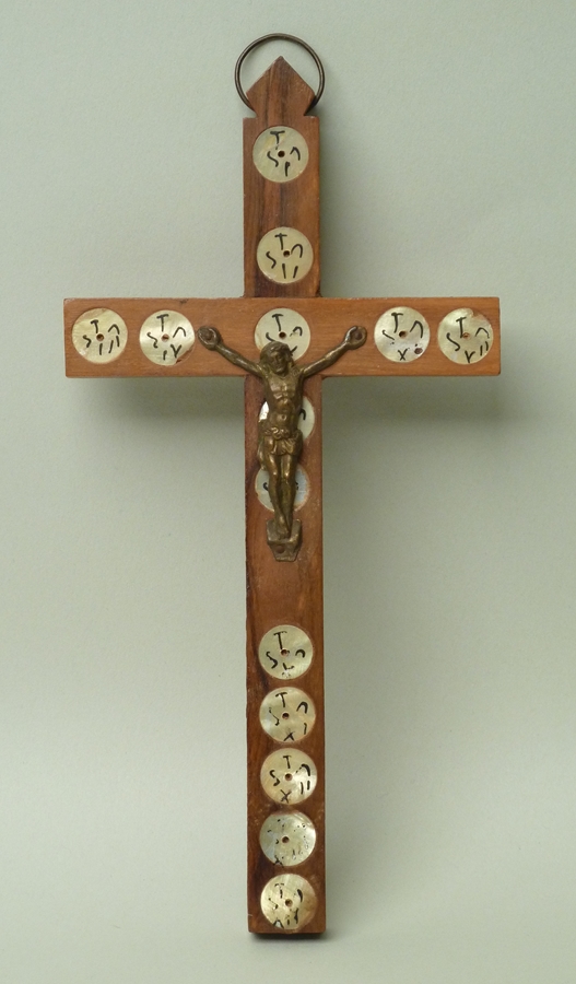 Kruisbeeld met veertien parelmoeren cirkels en met achterop "Jeruzalem"
