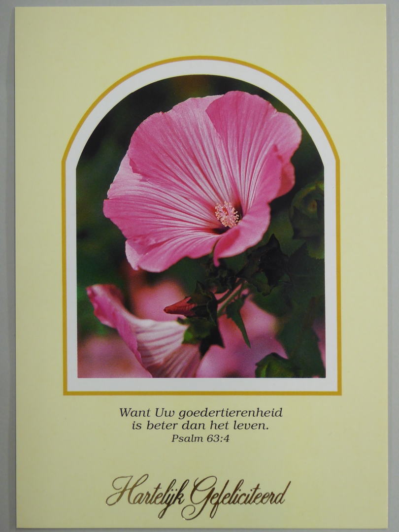 Prentbriefkaart, felicitatiekaart met bloemen en bijbeltekst "Want Uw goedertierenheid is beter dan het leven. Psalm 63:4"
