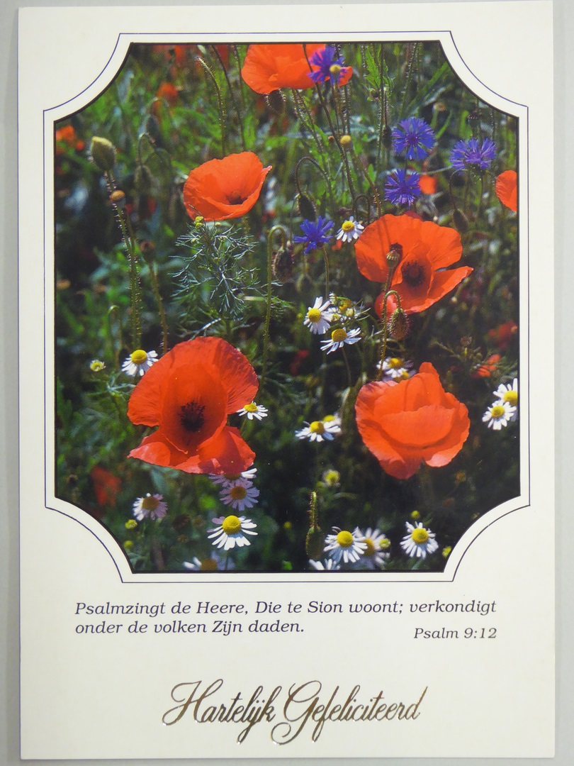 Prentbriefkaart, felicitatiekaart met bloemen en bijbeltekst "Psalmzingt de Heere, Die te Sion woont; verkondigt onder de volken Zijn daden. Psalm 9:12"