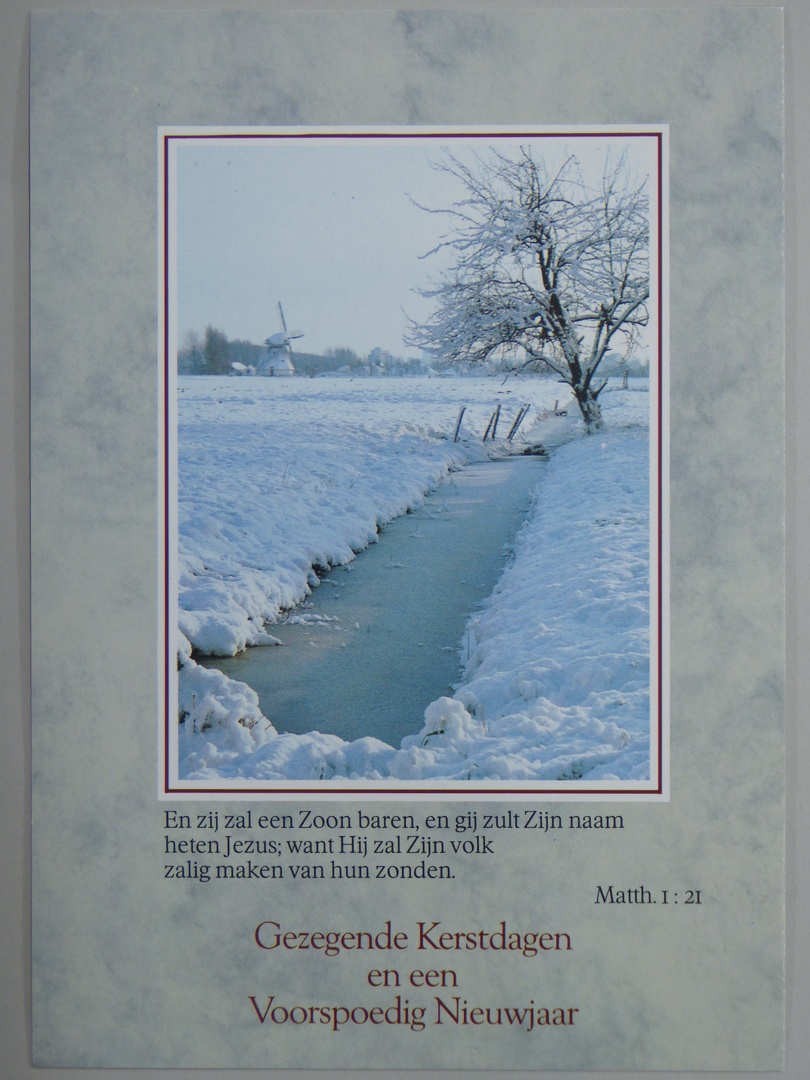 Kerst- en nieuwjaarskaart met winterlandschap en bijbeltekst "En zij zal een Zoon baren, en gij zult Zijn naam heten Jezus; ..."