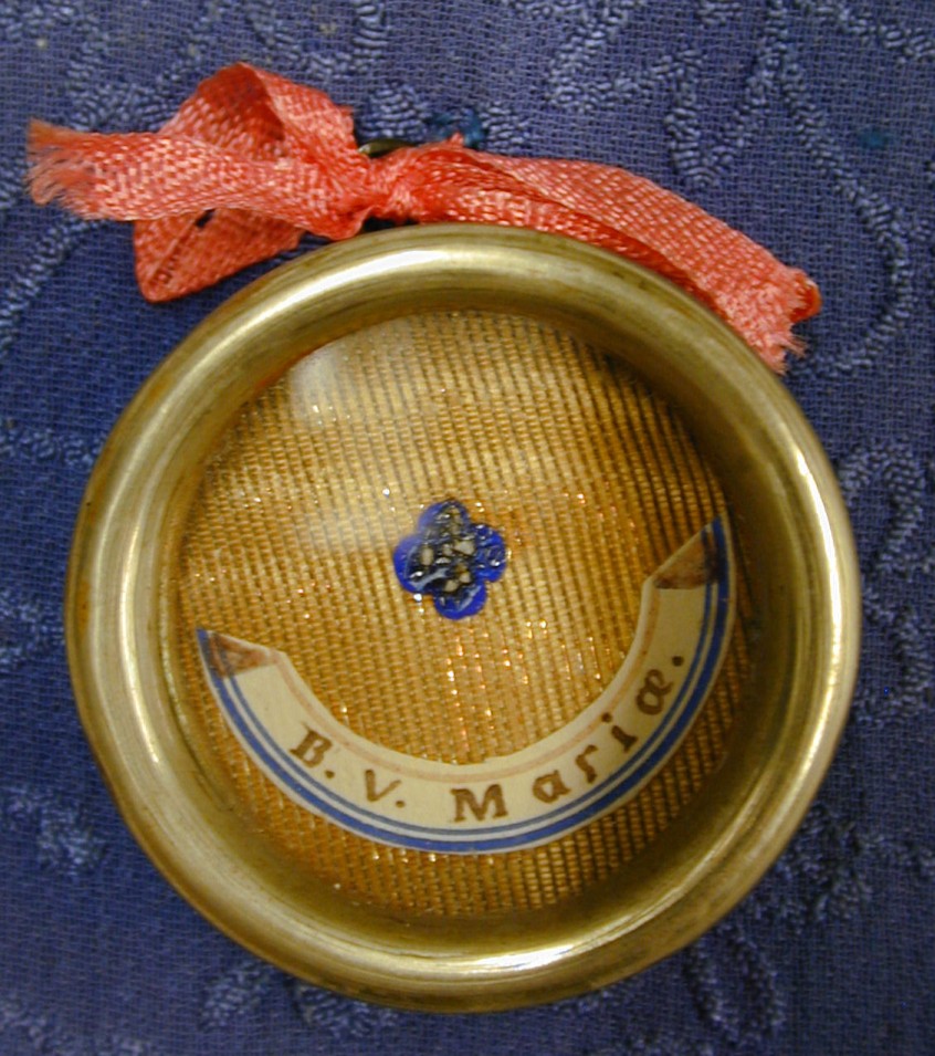 Reliekmedaillon met reliek van Maria bevestigd aan blauw vierkant
