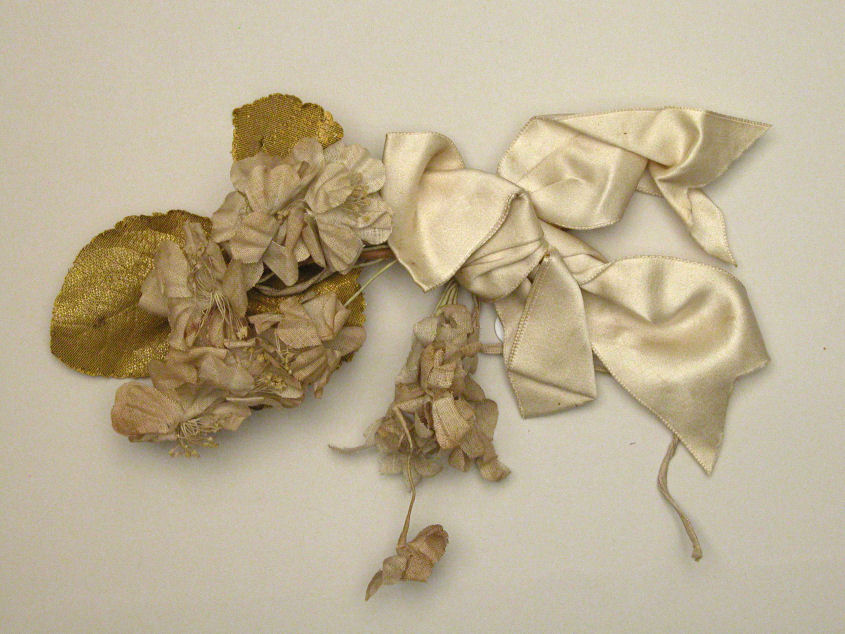 Bosje witte bloemen met gouden blaadjes met witte strik, voor staakmadonna
