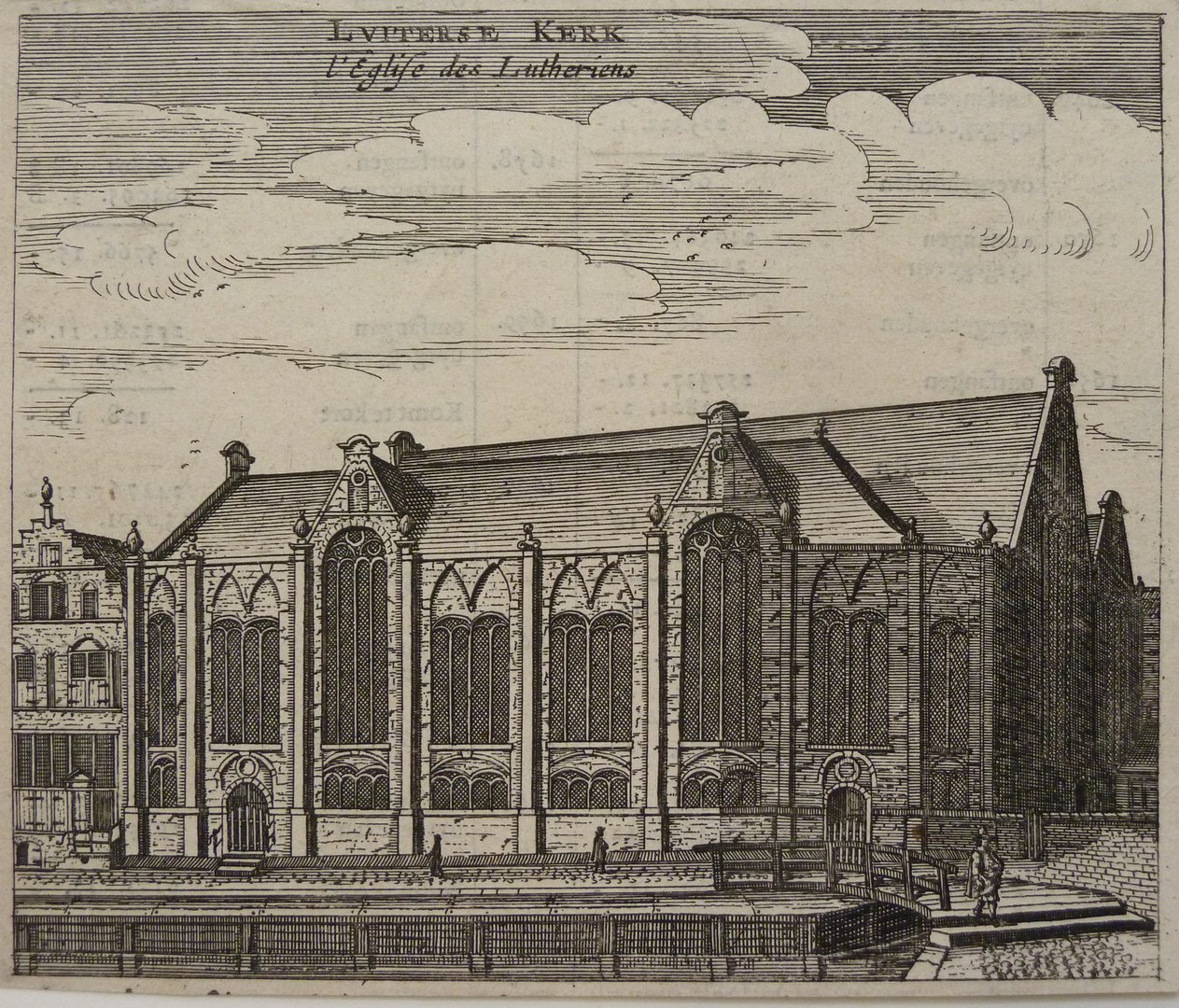 Gezicht op de Oude Lutherse Kerk aan het Spui, vanaf de overzijde van het water. Opschrift boven de prent: 'Luiterse Kerk/ L'Eglise des Lutheriens'.