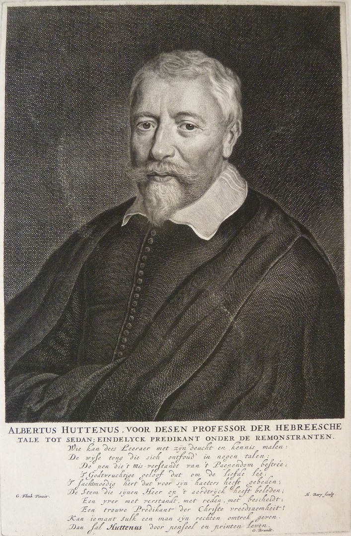 Borstbeeld naar links, met mantel, platte kraag, kort haar, snor en sik. Met tweeregelig onderschrift: 'Albertus Huttenus...' en tienregelig gedicht door G. Brandt: 'Wie kan dees Leeraer...'.