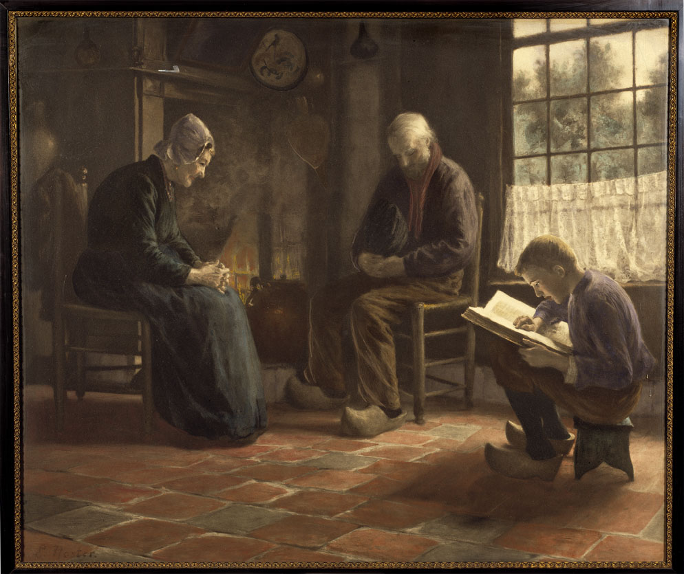 Plaat naar Ps.90:10, met jongen die vader en moeder voorleest uit de bijbel