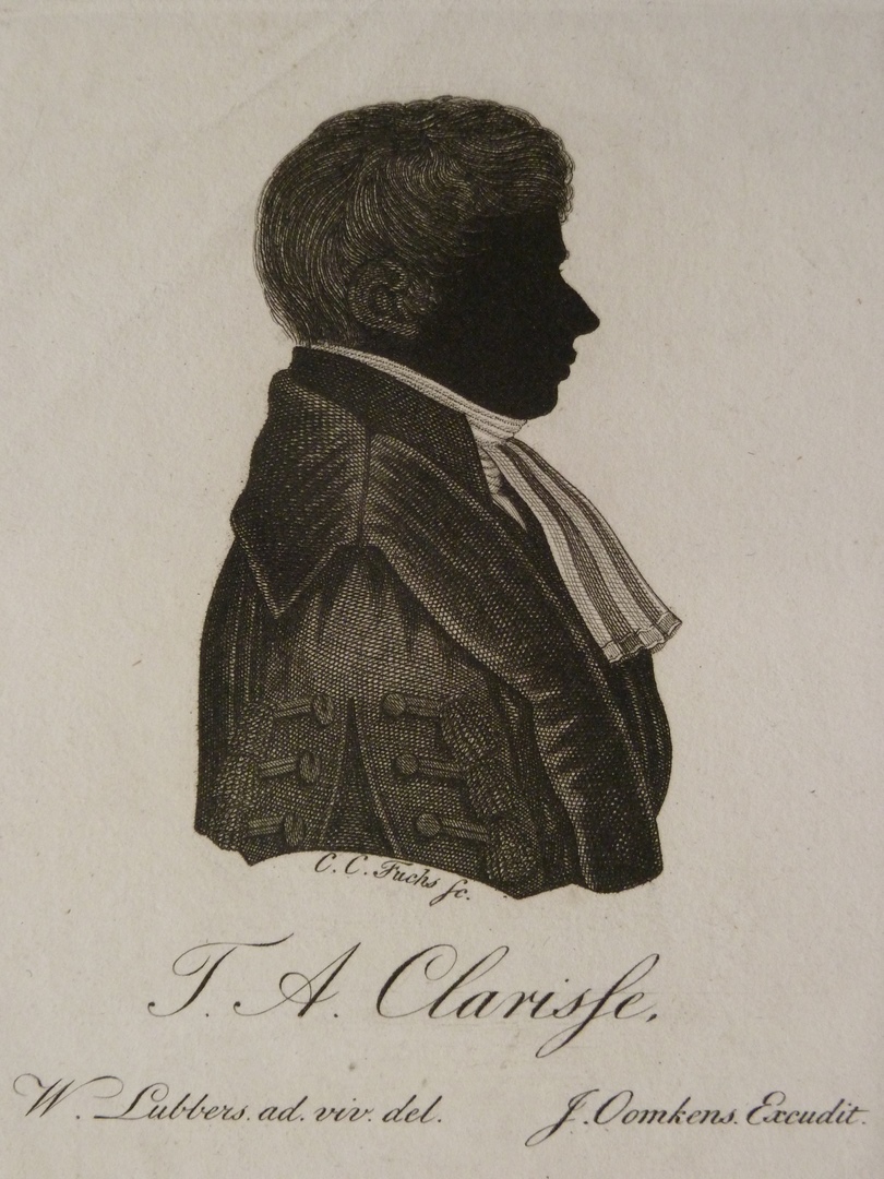 Borstbeeld en profil naar rechts. Met onderschrift : 'T.A. Clarisse'.