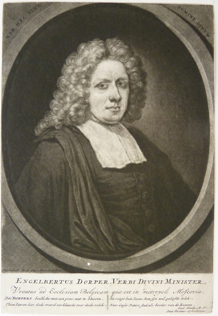 Borstbeeld naar rechts. In ovaal met ter weerszijden zijn motto : 'Non haec ... divum'. Tweeregelig Latijns onderschrift: 'Engelbertus Dorper ... Moscoviae' en vierregelig gedicht door L. Smids: 'Dit's Dorpers beeld ... Russen'. Onder in ovaal een klein gaatje.
