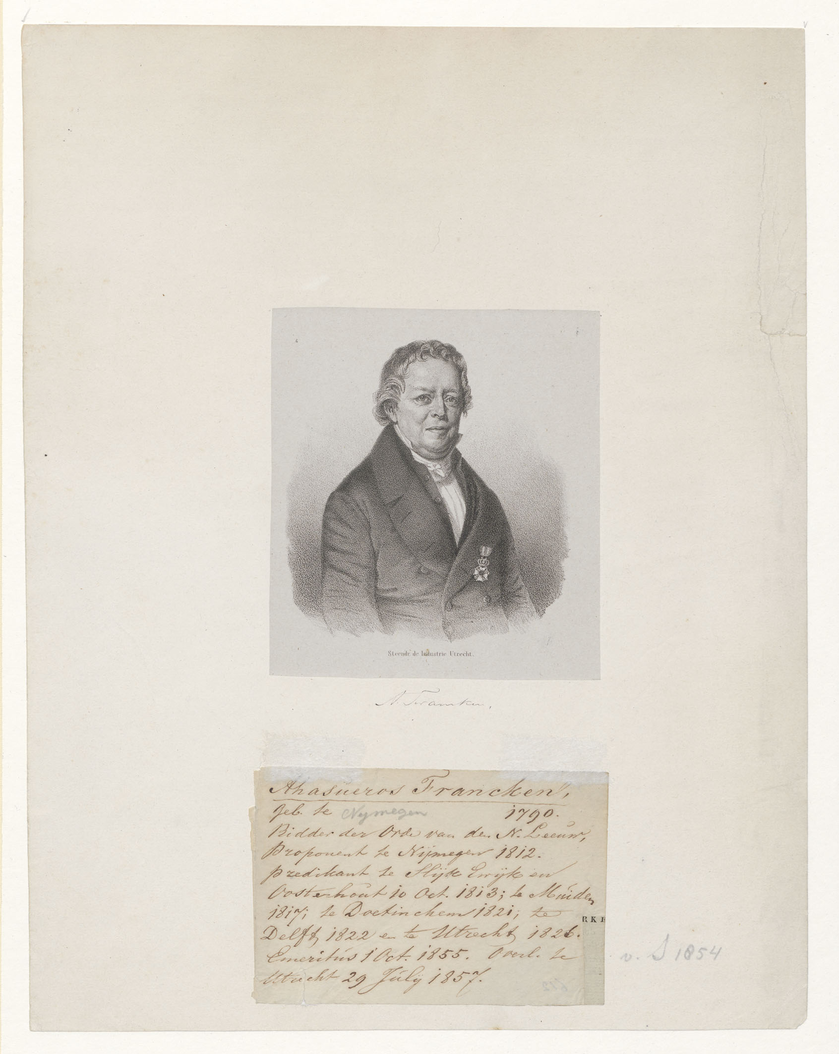 Portret van Ahasveros Francken (1790-1857), predikant te Oosterhout, Muiden, Doetinchem, Delft, Utrecht