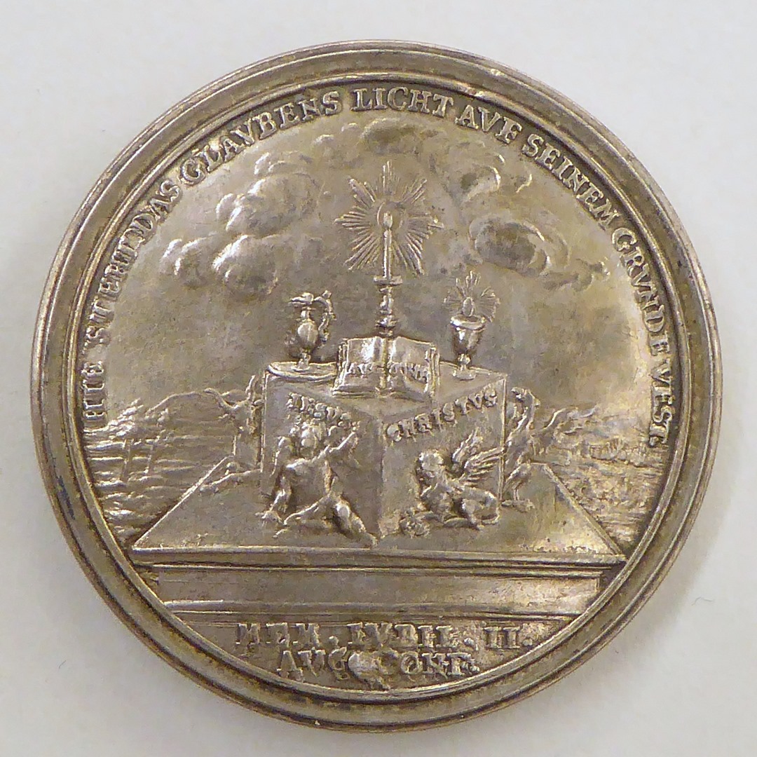 Penning, altaar met boek, evangelistensymbolen, kan, kandelaars, randschrift, kz. altaar en engel