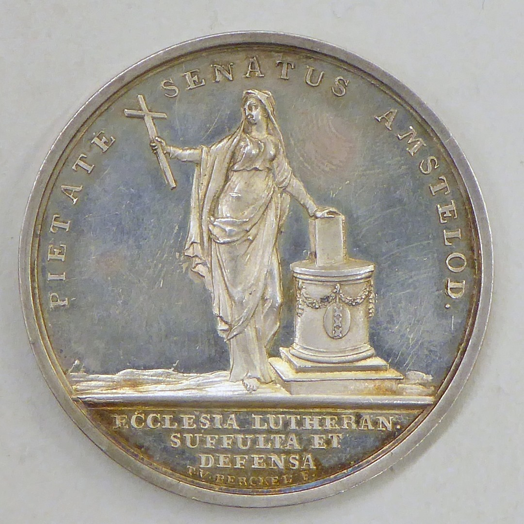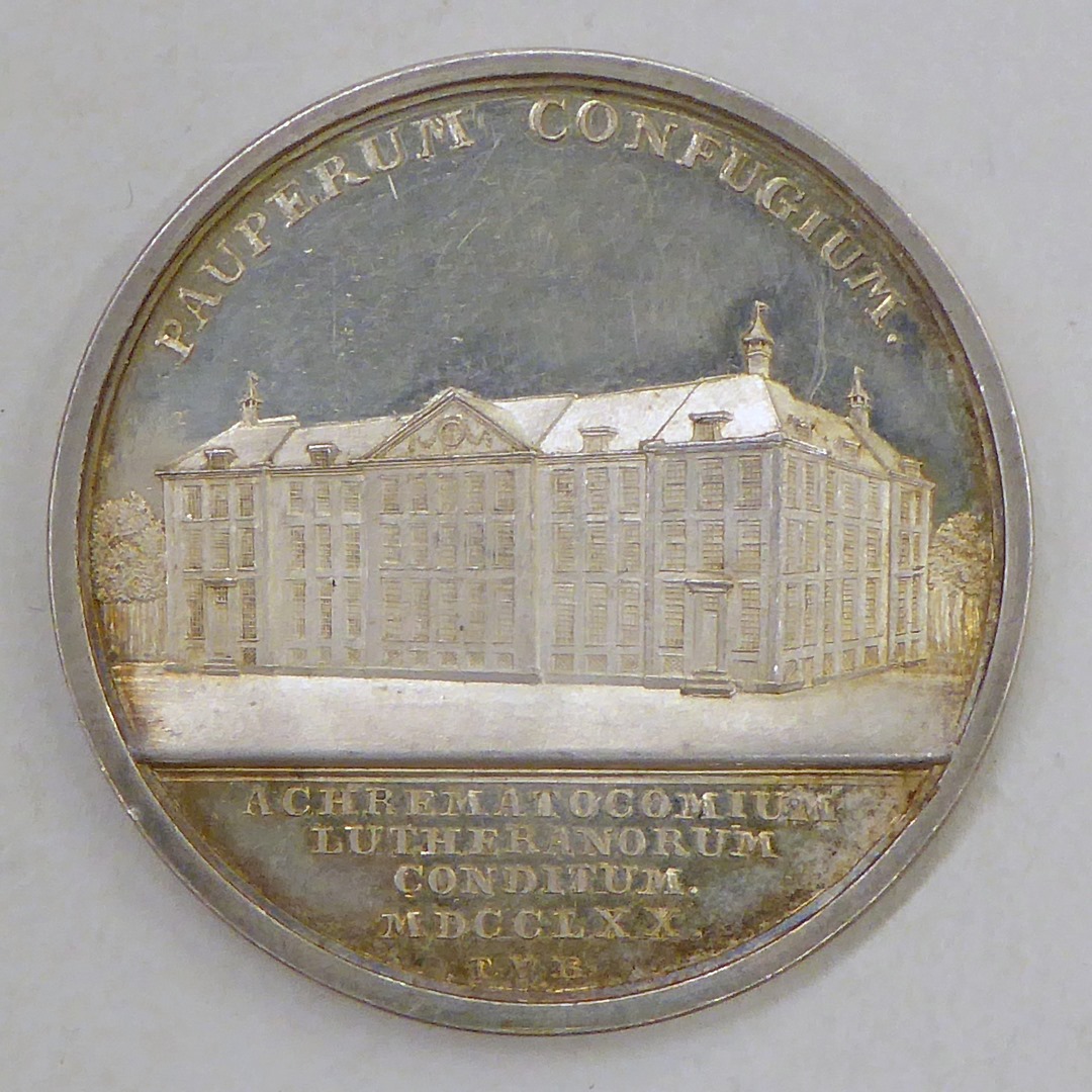 Penning, afbeelding van Luthers Weeshuis Amsterdam, tekst, kz. geloof, tekst