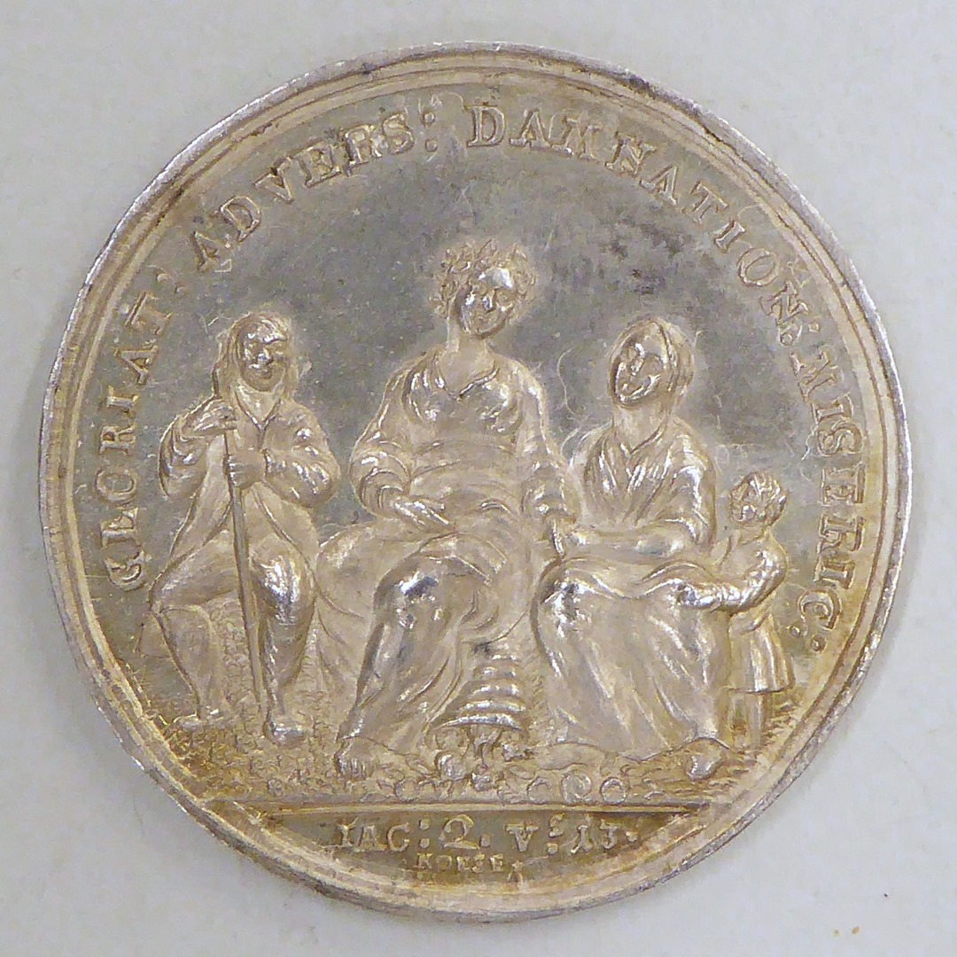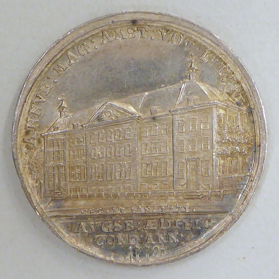 Gedenkpenning inwijding lutherse diaconiehuis aan Nieuwe Keizersgracht, met "Annue. Mag ... Ann 1770", kz. "Gloria Adversus"
