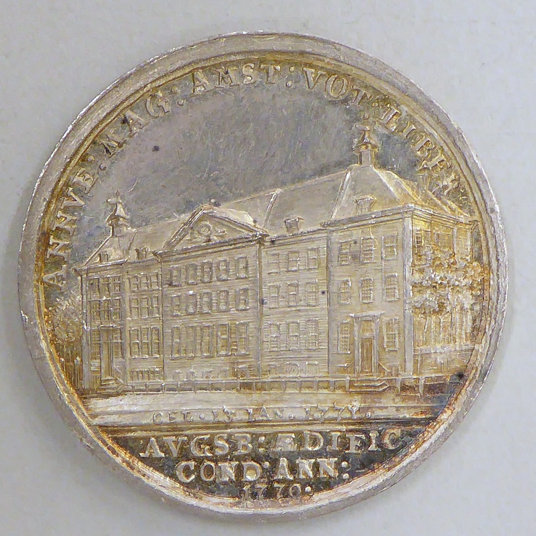 Gedenkpenning inwijding lutherse diaconiehuis aan Nieuwe Keizersgracht, met "Annue. Mag ... Ann 1770", kz. "Gloria Adversus"