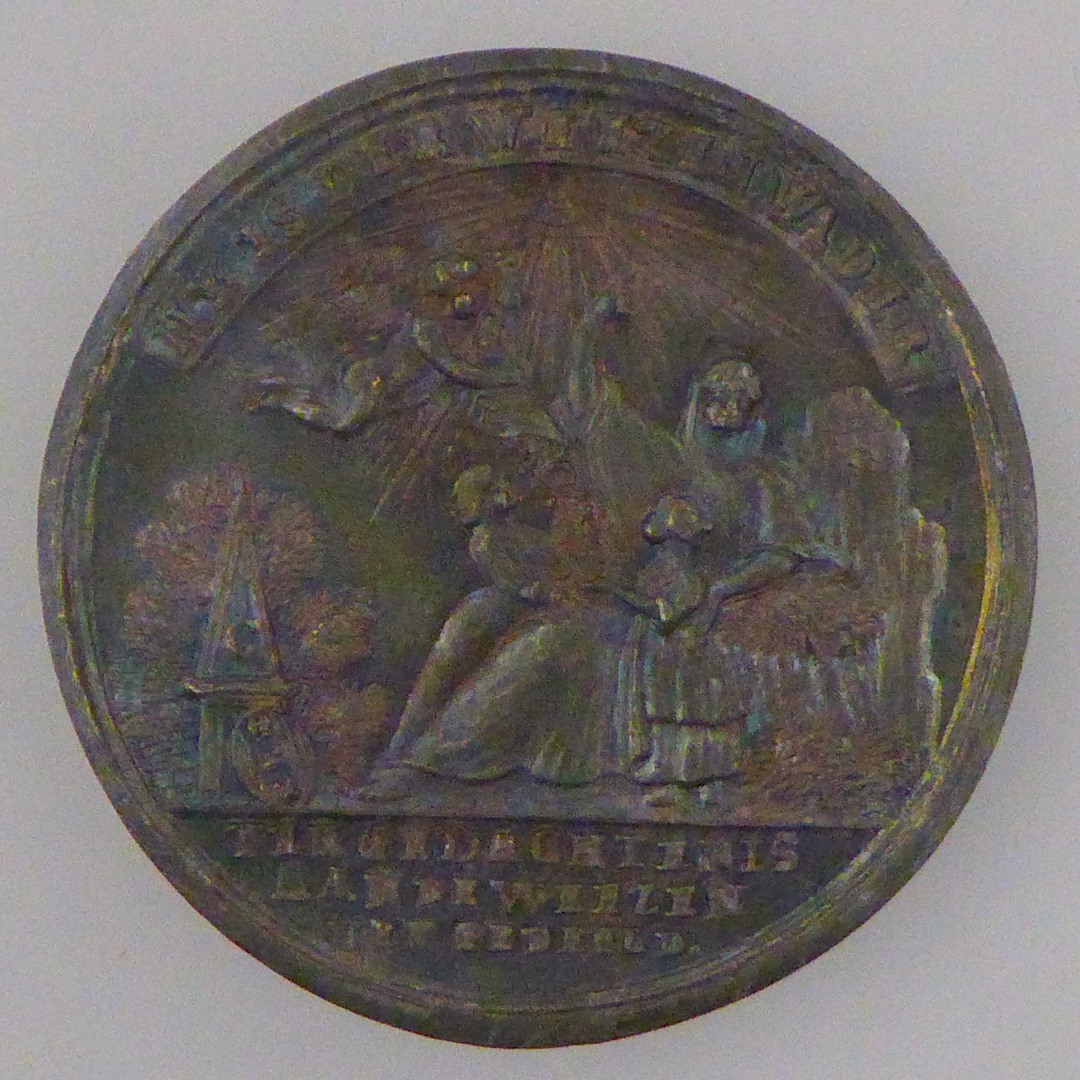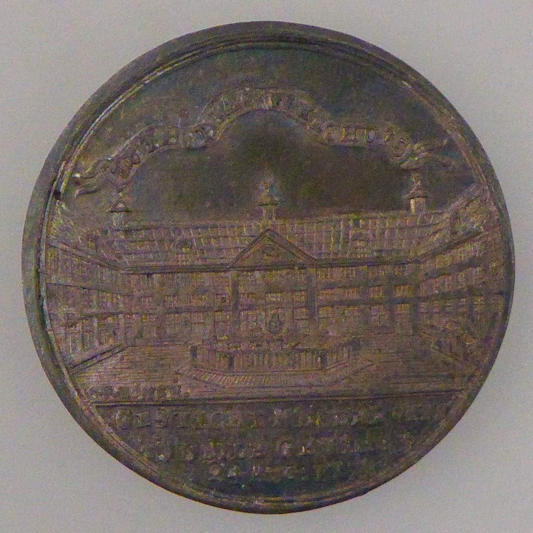Penning, weeshuis, met "Luth Diac. Weeshuis ...", kz. vrouw met weesjongen en weesmeisje