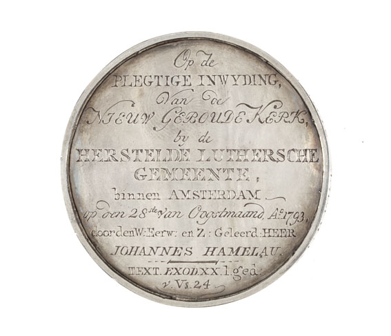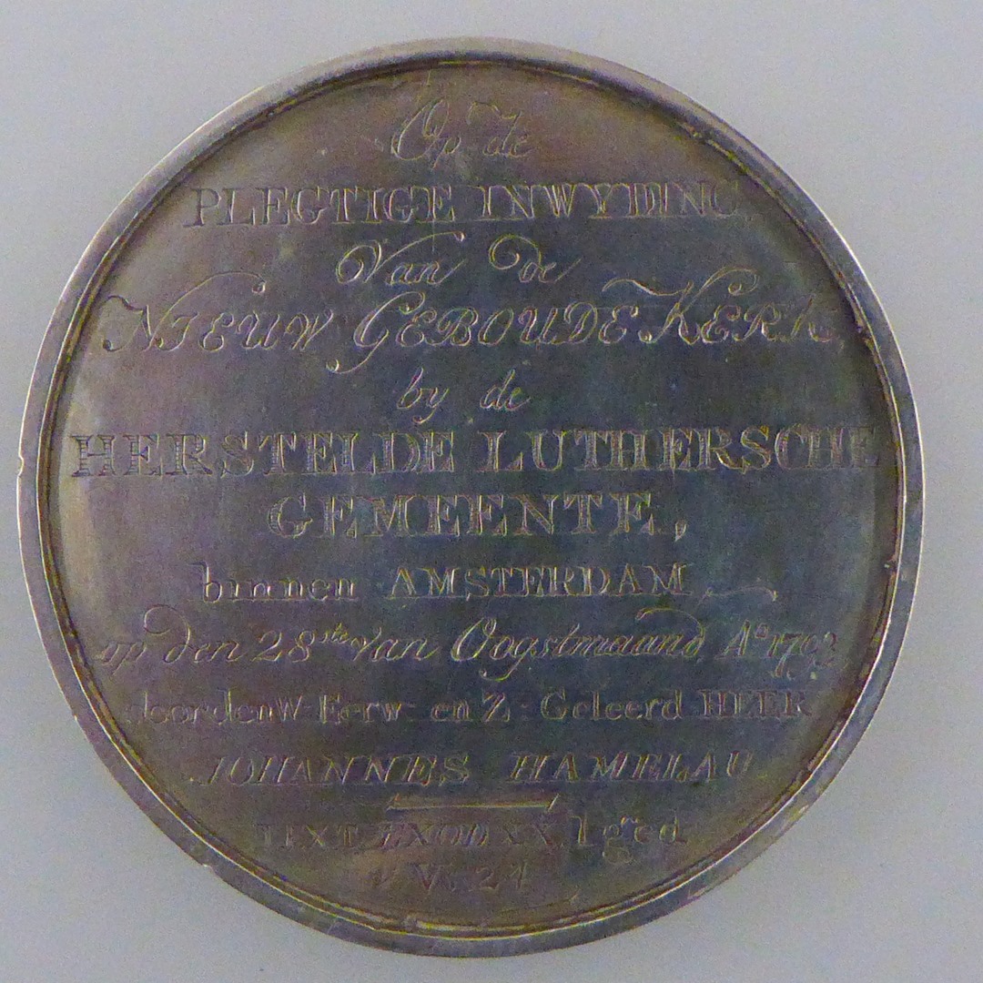 Voorzijde: op de achtergrond het kerkgebouw, door hemellicht bestraald, op de voorgrond de afbeelding van ds. Johannes Hamelau naar rechts. Tekst: Dominu Johannis Hamelau 1793. Erboven: God alleen de eere. Keerzijde: tekst: Op de plegtige inwijding van de nieuw gebouwde kerk by de Herstelde Luthersche Gemeente, binnen Amsterdam, op de 28de van Oogstmaand Ao. 1793, ...
