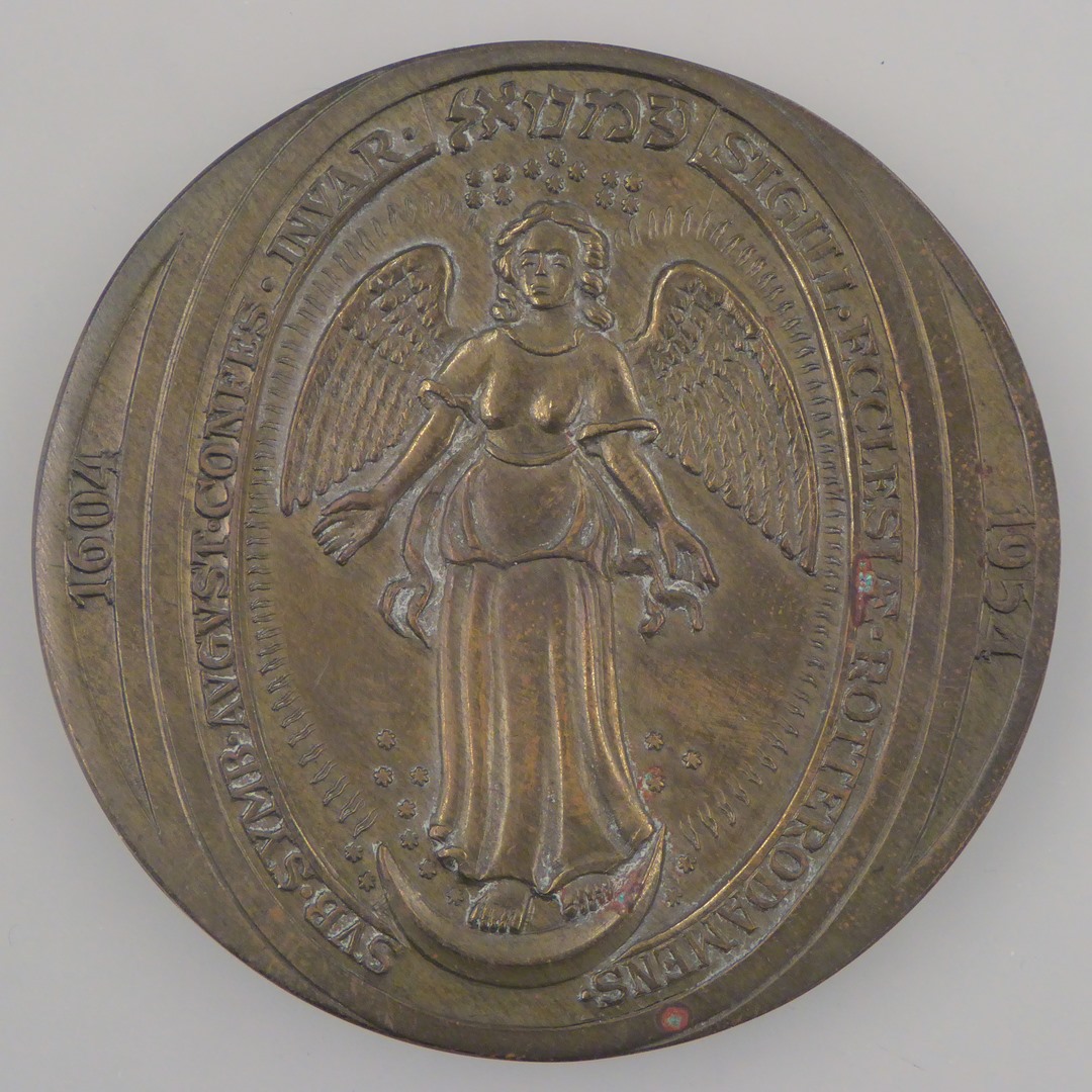 Penning op het 350-jarig bestaan van de Evangelisch Lutherse Gemeente Rotterdam, met engel met randschrift "Sub symb. August...", kz. duif met olijftak, met "1604 1954"