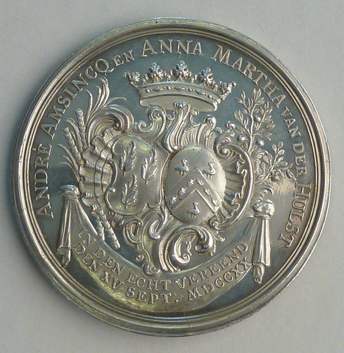 Huwelijkspenning op zilveren bruiloft van André Amsincq en Anna Martha van der Hulst met echtpaar, kz. wapens en tekst